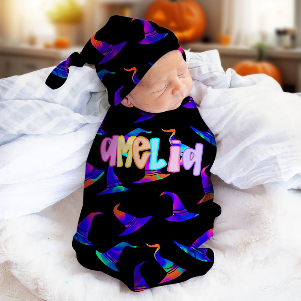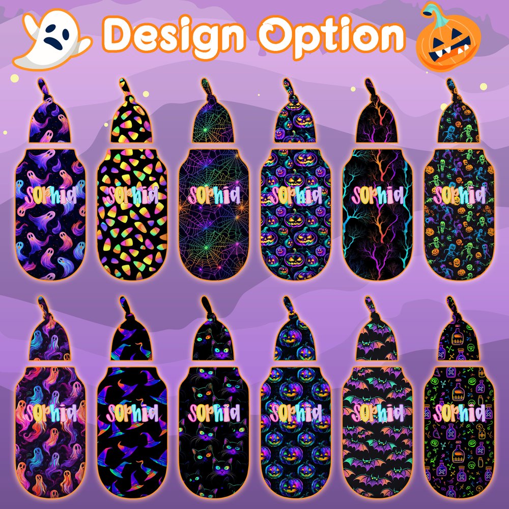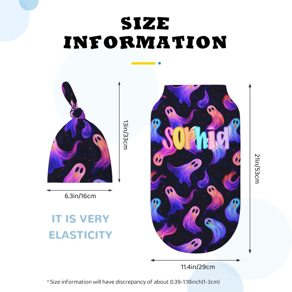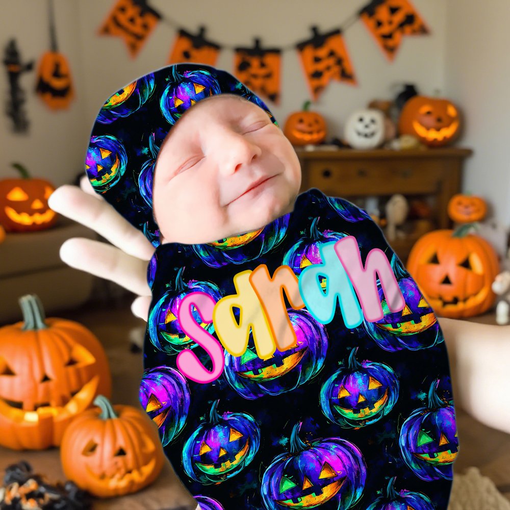 This Halloween set features festive elements, cleverly combining classic motifs like pumpkins and ghosts with baby names. Available in a variety of designs, this unique two-piece set includes a knotted hat and swaddle blanket, perfect for festive outfits while adding a special touch to your baby's first Halloween.