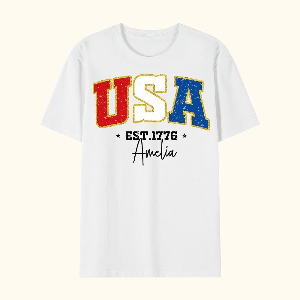 Celebrate the spirit of Independence Day with special clothes, which feature USA font designed with the colors of the American flag—red, white, and blue, capturing the essence of national pride and festivity. A custom name adds a touch of personality.