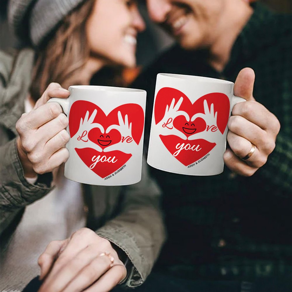 This heart-themed mug is specially designed for couples who love life and want to express affection, making it an exclusive gift. The design features hands forming a heart shape, a red heart, and a warm smile pattern. The words "Love You" and the customized couple’s names allow the recipient to feel a unique emotional connection.
