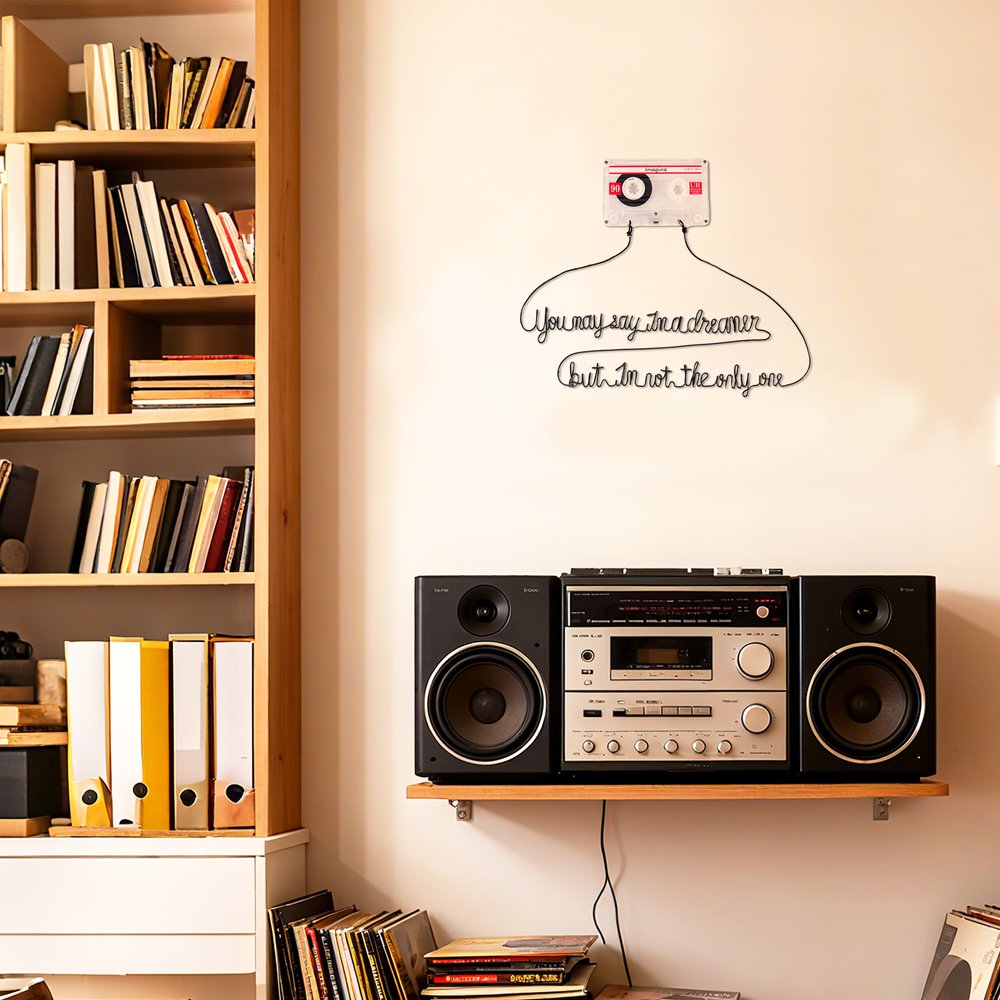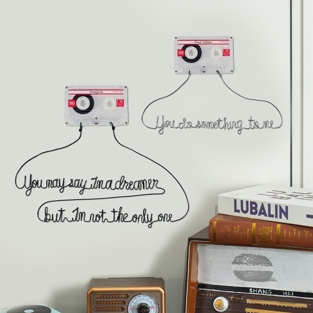 Featuring a classic retro mixtape, this wall decor is artistically paired with hand-wound wire that forms custom lyrics or text. This unique piece beautifully blends musical nostalgia with creative art. With a variety of wire colors to choose from, you can Personalise it to match your style, transforming any blank wall into a striking visual centerpiece that fills your space with a rich, vintage music vibe.