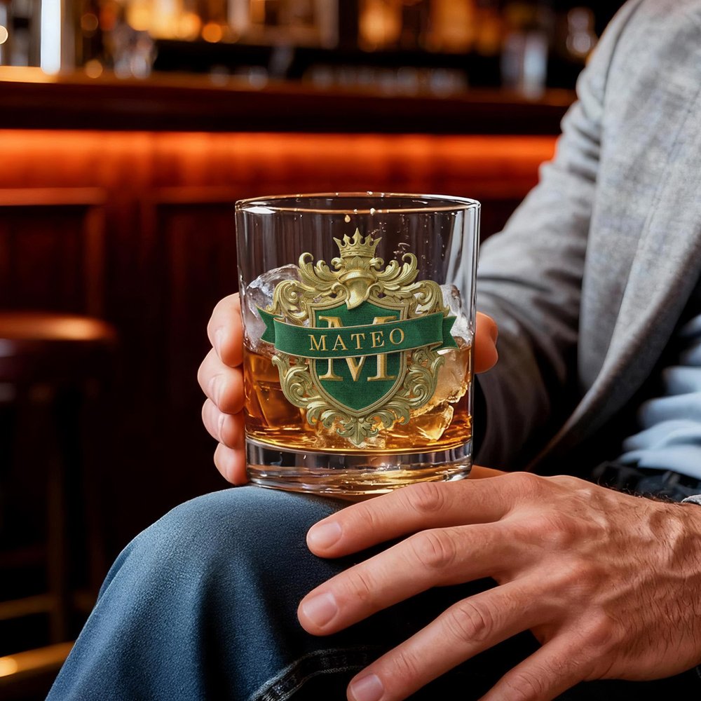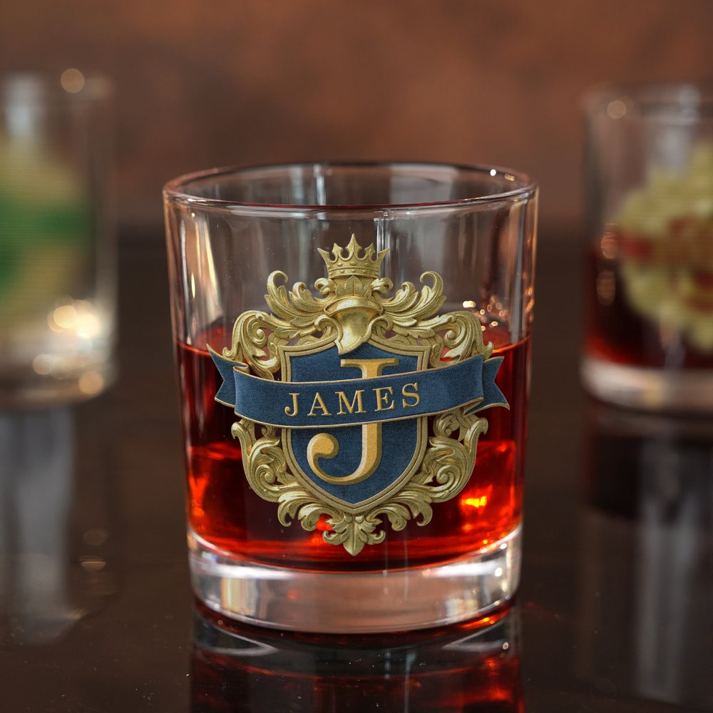 This whisky glass features a classic, vintage shield emblem design with intricate, symmetrical gold patterns, enhancing its visual depth and artistry. Customizable with initials and a name, it exudes elegance and aristocratic sophistication. More than just a glass, it reflects your personality and appreciation for fine spirits.