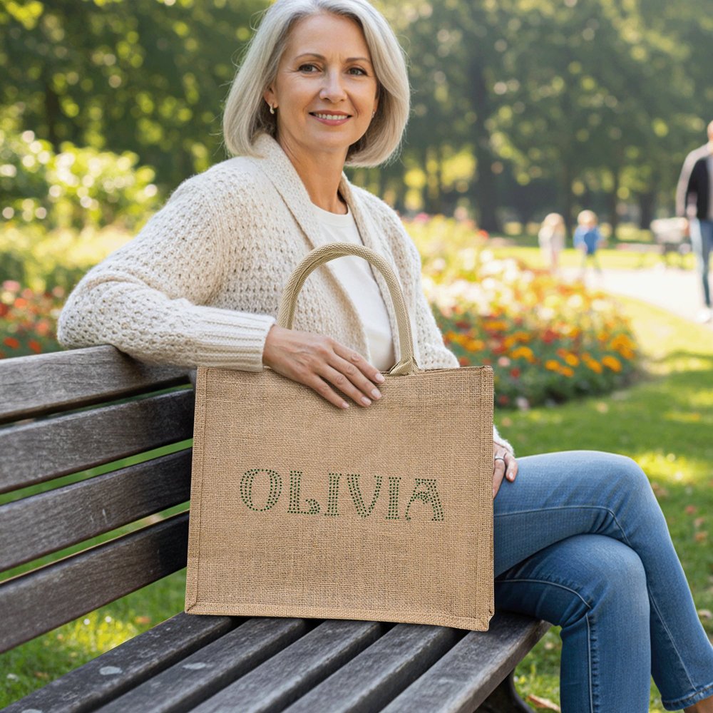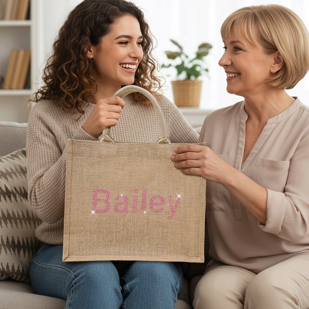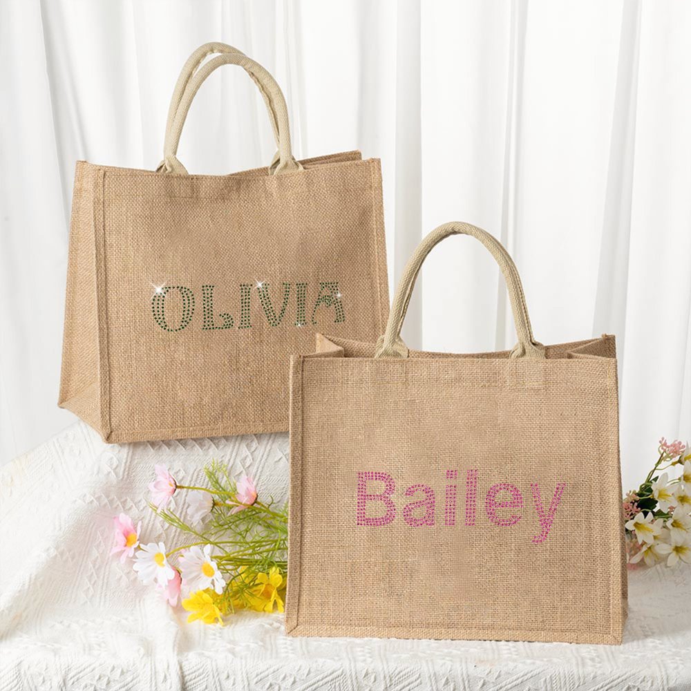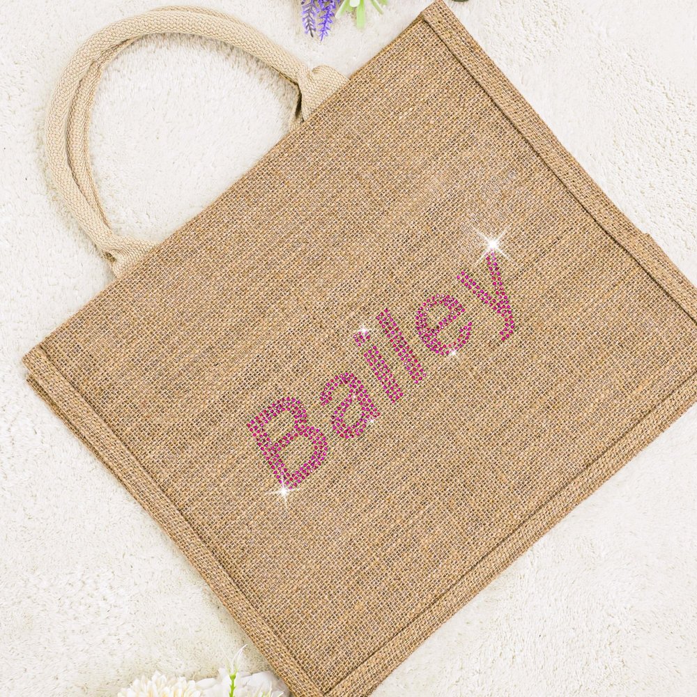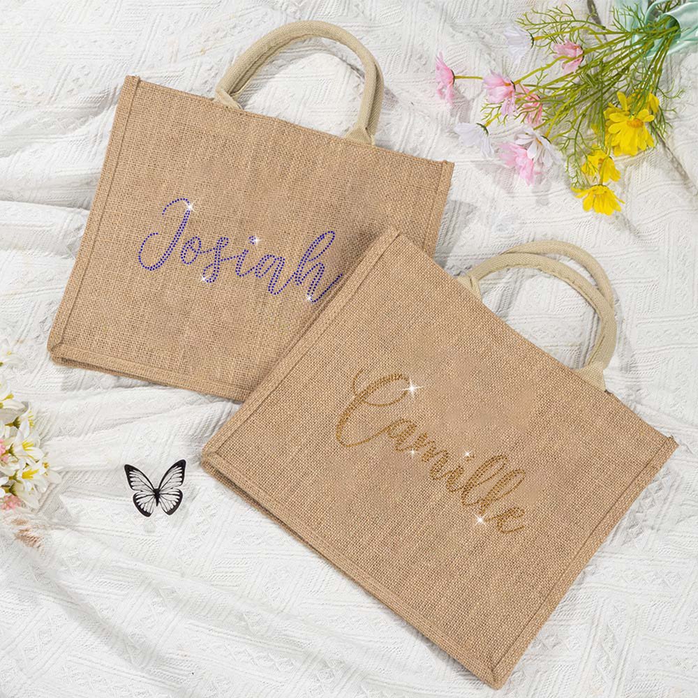 Personalised Rhinestone Large Jute Tote Bag with Name Wedding Party Birthday Gift for Women