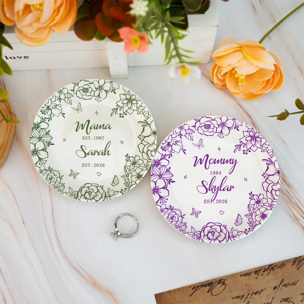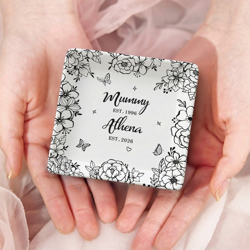 Drawing inspiration from the delicate beauty of spring gardens, this Personalised jewellery dish features elegant floral line art and graceful butterfly motifs. The creative layout offers a choice among classic round, modern square, and romantic heart shapes to suit any aesthetic preference. You can customize the centre with a unique name and year, transforming a simple household item into a bespoke narrative of love and appreciation that captures precious family memories.
