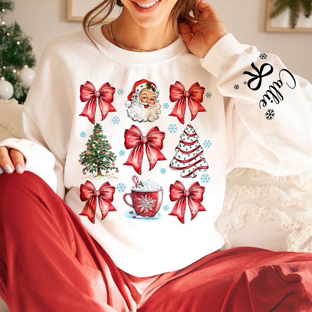 Inspired by Santa's gift party, this garment cleverly combines Santa Claus, snowflakes, Sweets cups, bows, and classic Christmas trees into a joyful, festive scene. It retains traditional Christmas colors while infusing a modern and stylish feel. You can customize the sleeves with delicate bows and your name, making each piece a unique Christmas outfit. Please note that the name on the white clothing is in black, and the name on the black clothing is in white.