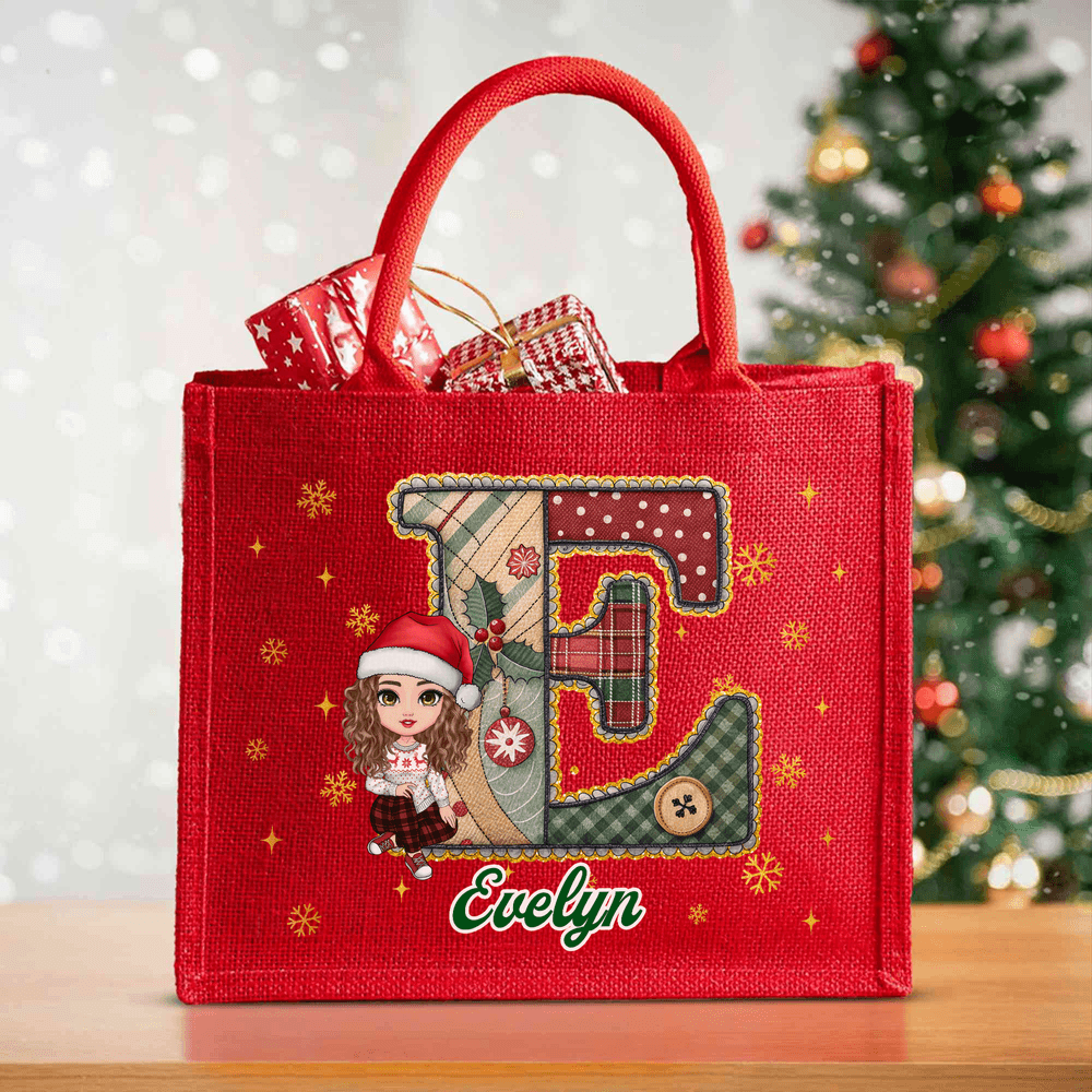 This tote bag features a vibrant red color as its primary tone, with a lively and adorable cartoon character donning a Santa hat, infusing the bag with energy and fun. The design centers around a prominent initial, with the letter's surface adorned with a variety of colorful Christmas-themed patterns, perfectly reflecting the warmth and joy of the holiday season. Additionally, the customization option for names makes each bag a unique creation, imbued with special emotional significance.