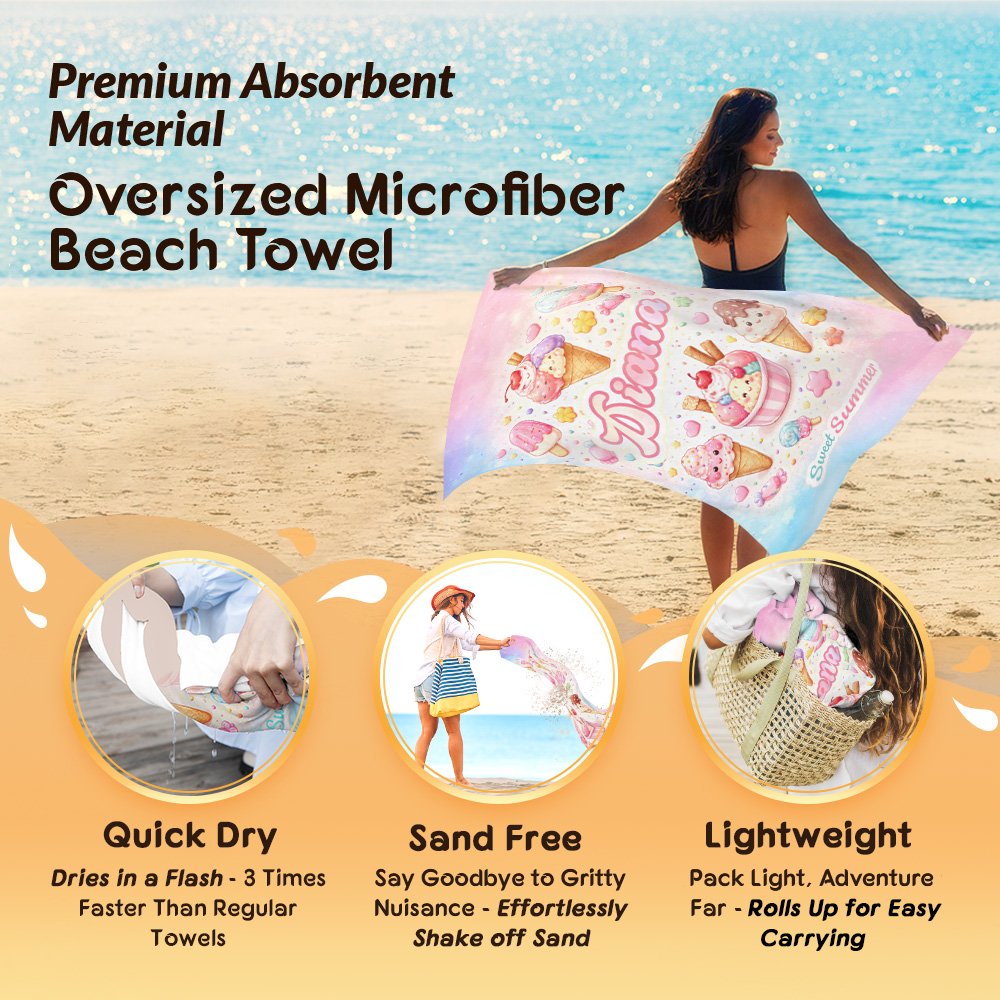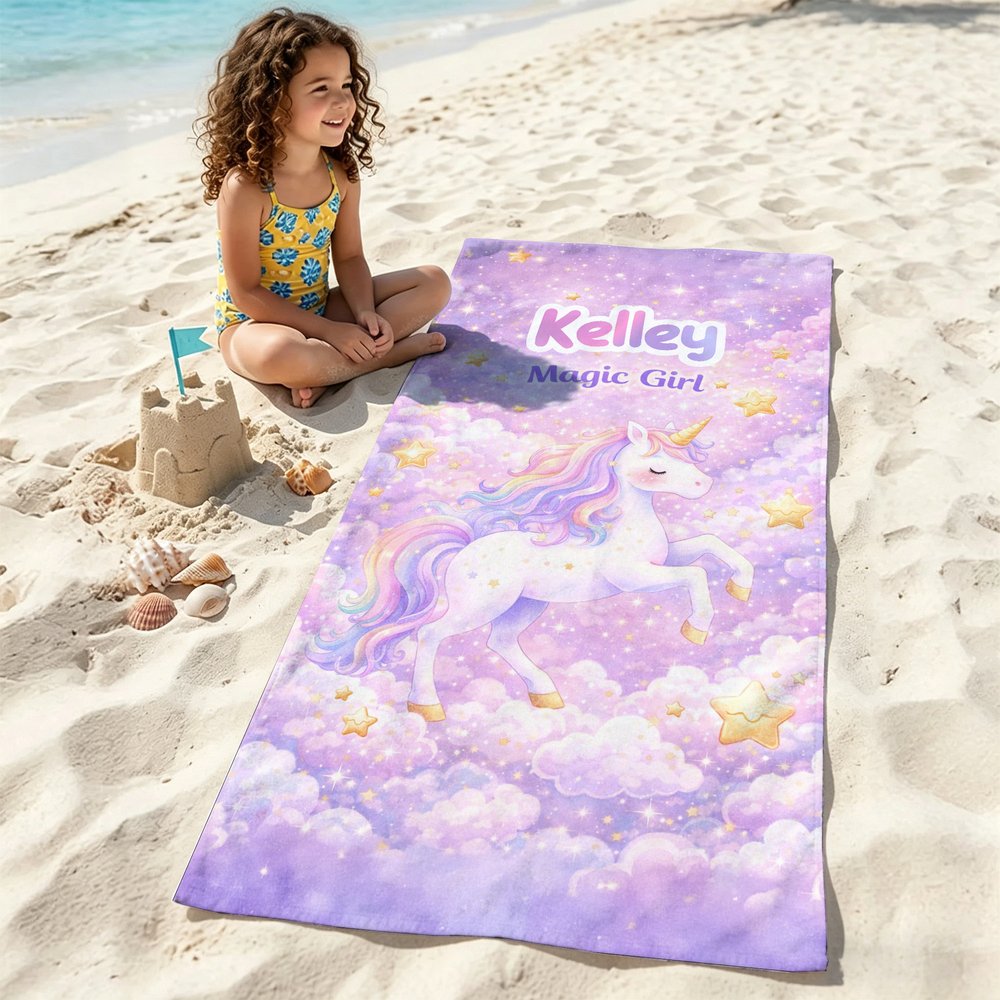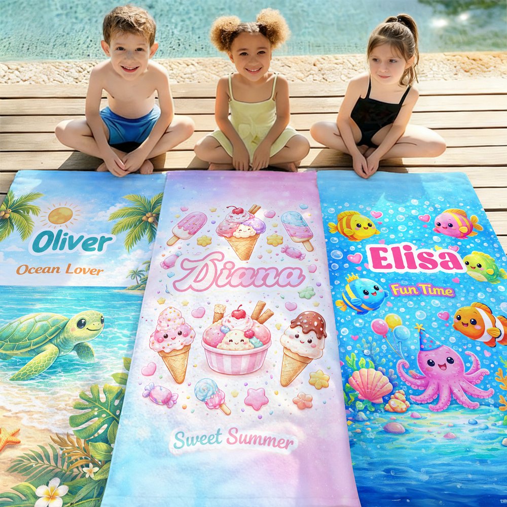 Incorporating a variety of adorable elements such as marine animals, astronauts, unicorns, ice cream, and rainbows, and paired with a Personalised name, this beach towel boasts a dreamy, childlike, and highly individual style. Its bright and eye-catching colors make it both stylish and unique, standing out in various settings.