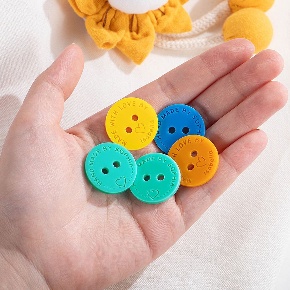These handmade pastel buttons are customizable with a name, unique and Personalised. Whether giving them to a friend, family member, or yourself, they add a special touch to any handmade project.