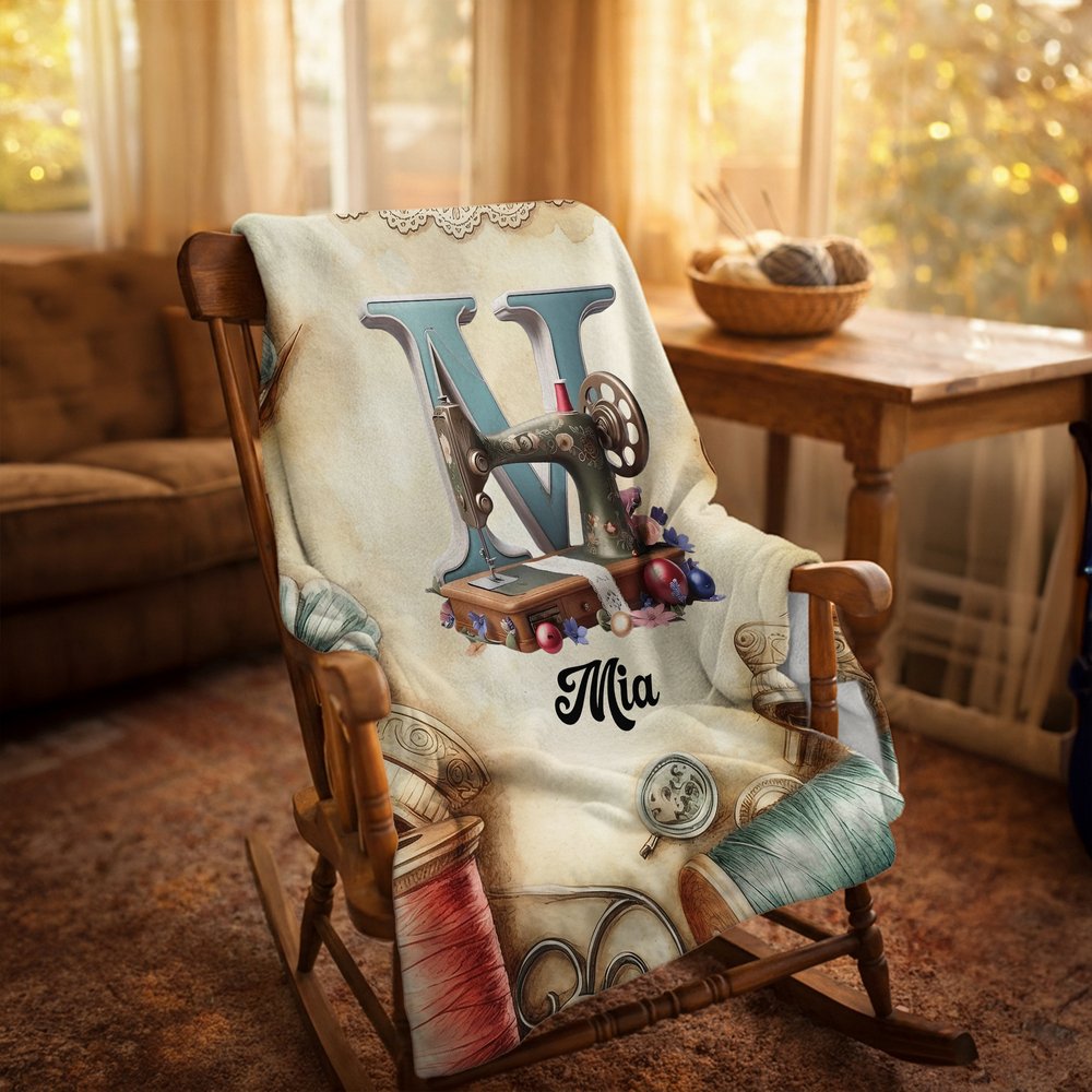 This soft blanket features a vintage sewing machine pattern, subtly incorporating delicate floral embellishments, and can be customized with your own initials and name for a truly Personalised touch. The design pays homage to the enduring arts of sewing, knitting, and crochet, celebrating handcrafted creativity. Its warm and comfortable aesthetic blends nostalgia with elegance, making it a truly personal and thoughtful decorative piece.