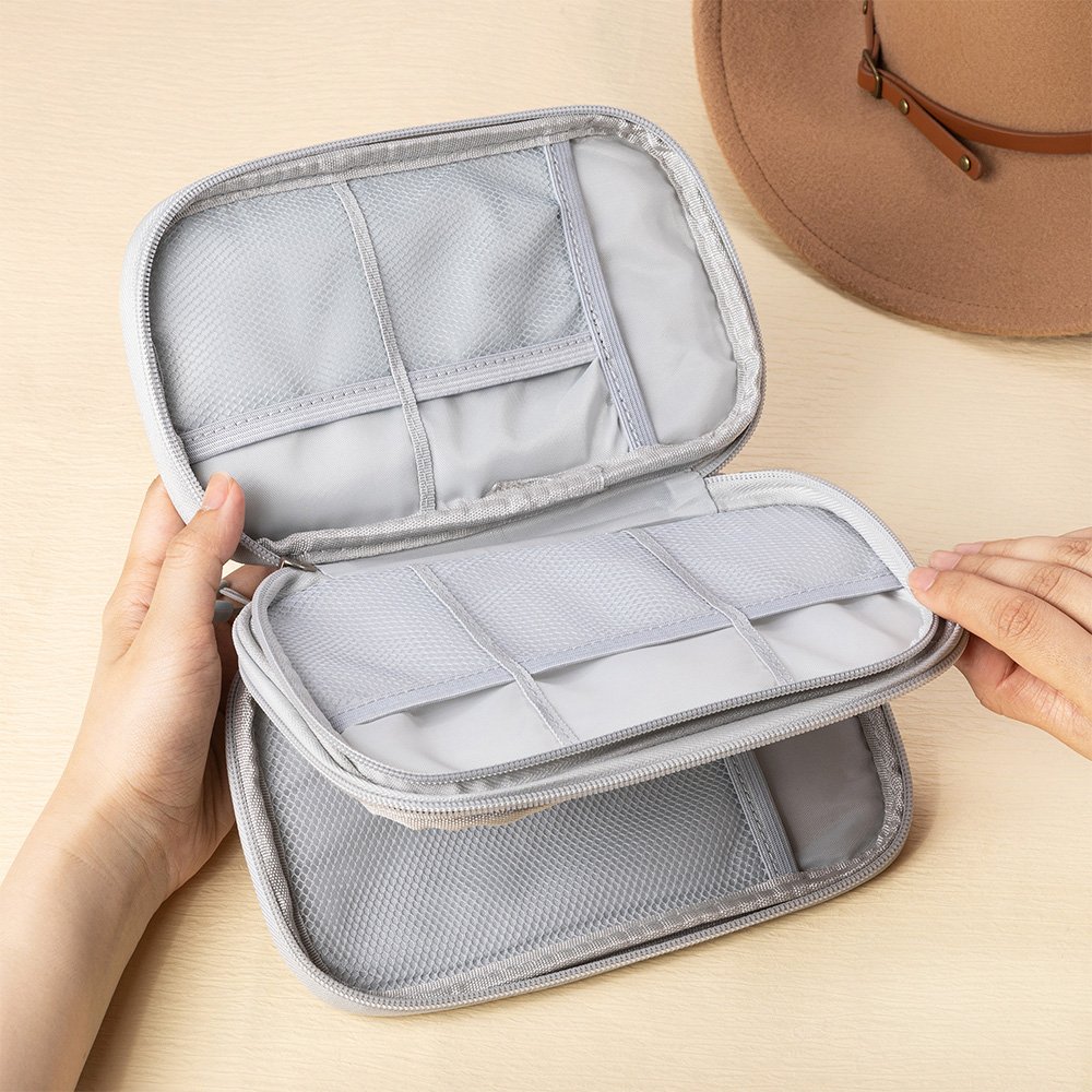 This bag has a spacious interior with 2 separate zippered compartments. One side has 6 separate slots to hold additional small items such as safety pins, hair clips, hair nets and hair ties, hair nets, hair ties, etc. The other side has 2 compartments to hold larger items such as gloves, armbands, competitor numbers, triathlon watches, etc., to meet your storage needs.