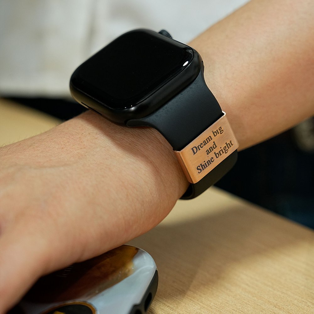 This watch band charm features a distinctive design that balances simplicity with personality. It supports customization of 1 to 3 lines of text, perfect for engraving a personal mantra or a heartfelt message. With 8 font styles to choose from, it caters to diverse preferences, ensuring each piece becomes a unique expression of the wearer's individuality and taste. It also effortlessly complements both business attire and casual wear, showcasing a unique style.