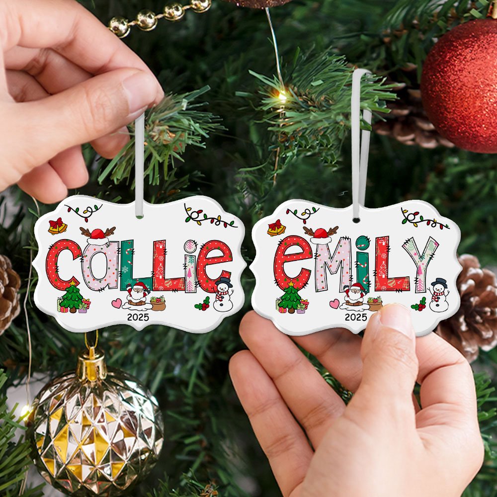 The cartoonlike design style makes this ornament full of children's fun and joy, and the clever integration of various Christmas elements such as Santa Claus, snowman, gift box, Christmas tree, and customizable name makes the whole ornament lively and interesting, full of holiday joy.