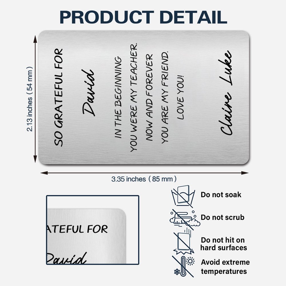 Show your appreciation with our Personalised "So Grateful For" wallet card. It’s a meaningful way to convey your feelings and let someone special know how much they matter to you. This card is small and portable and can be easily put into a wallet. When the recipient uses the wallet to pay for daily expenses, he will feel your most sincere gratitude.
