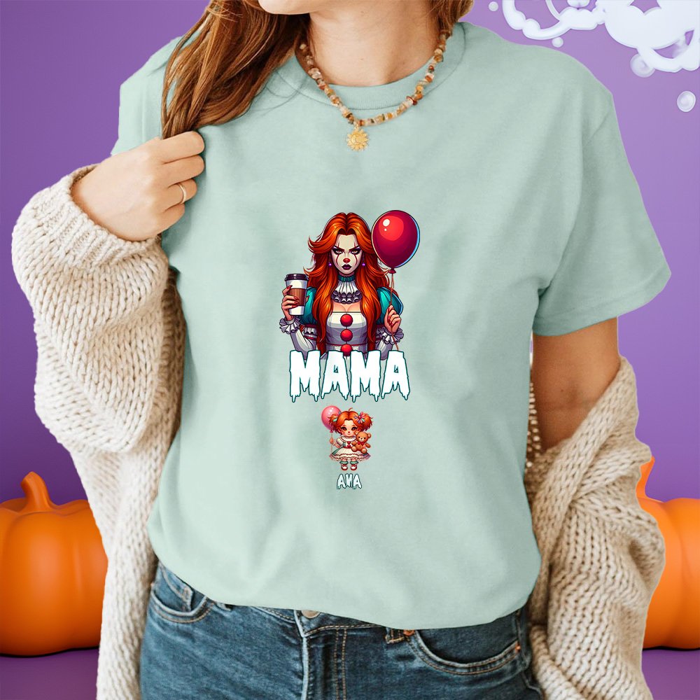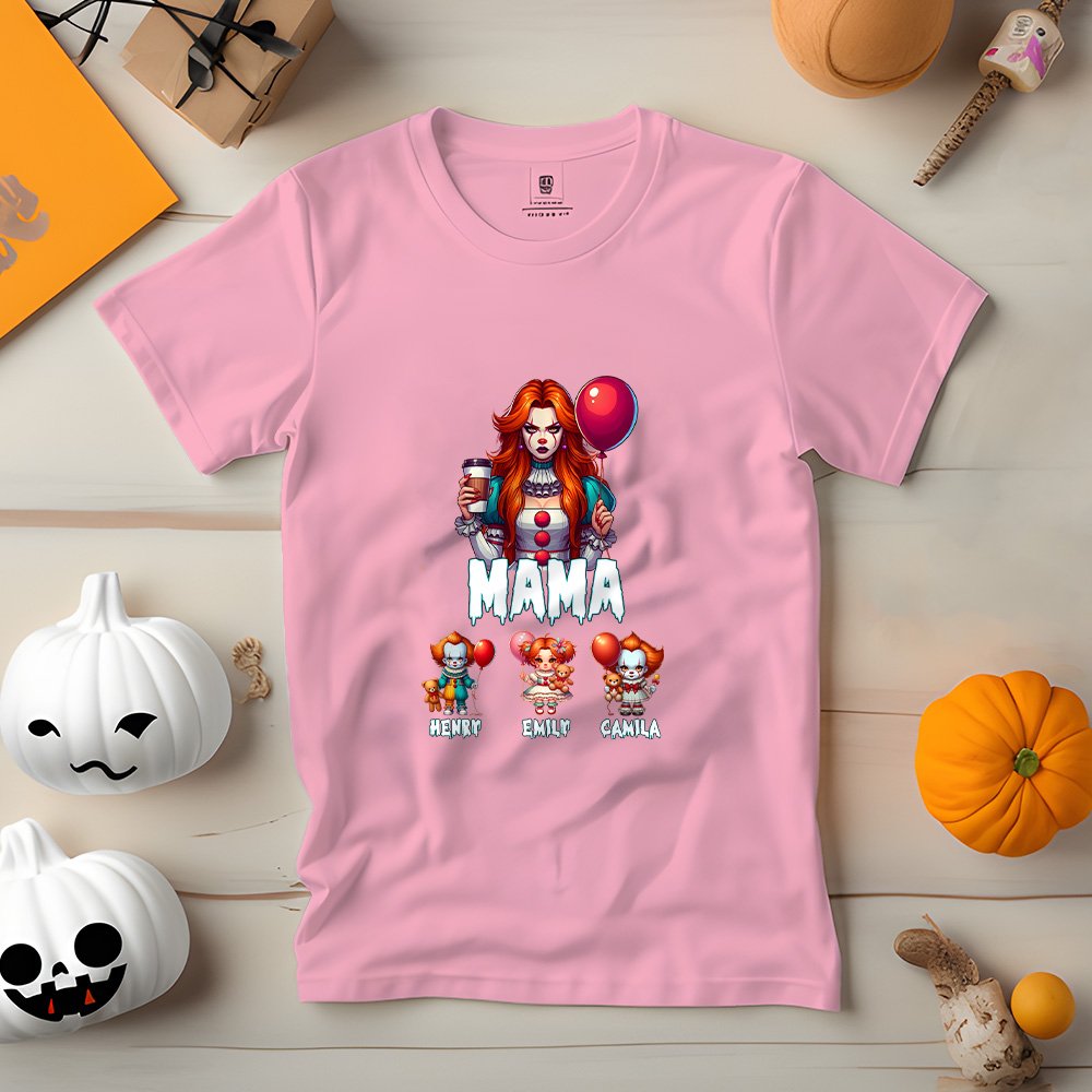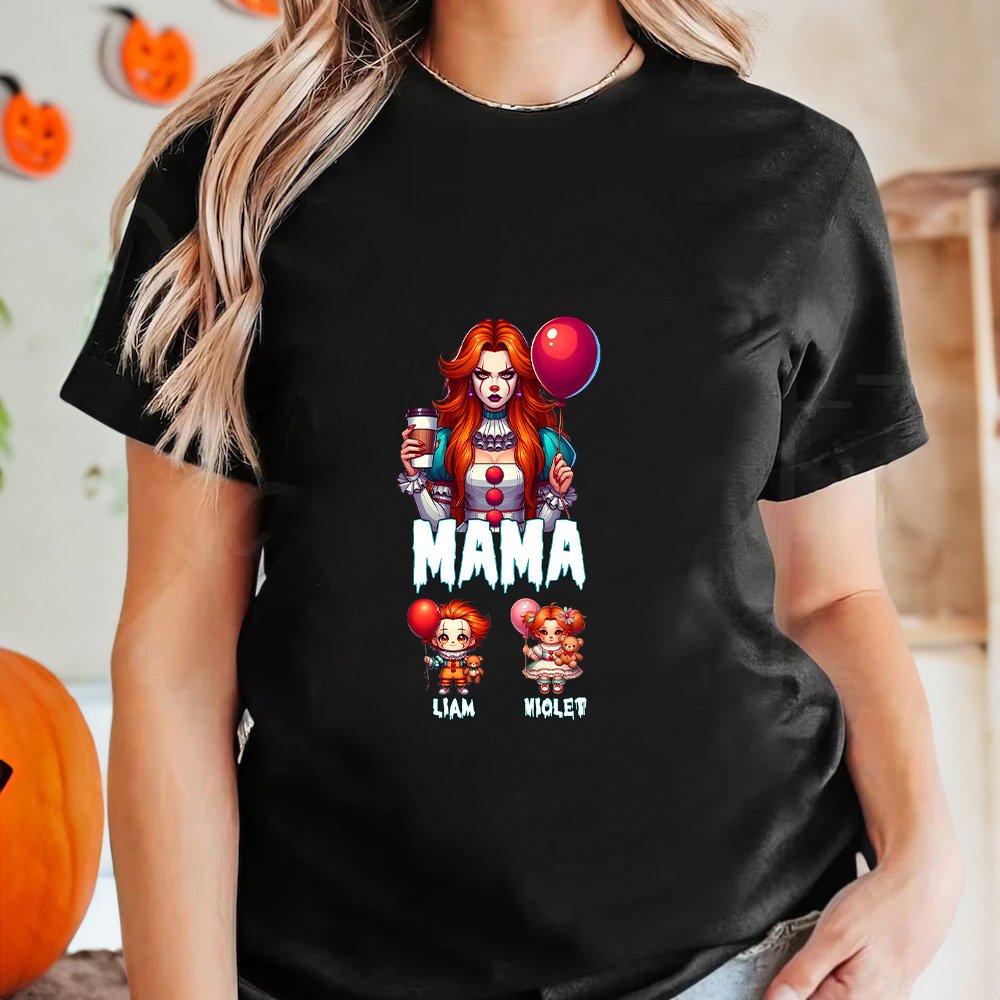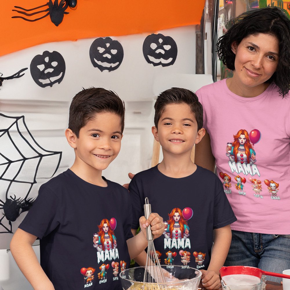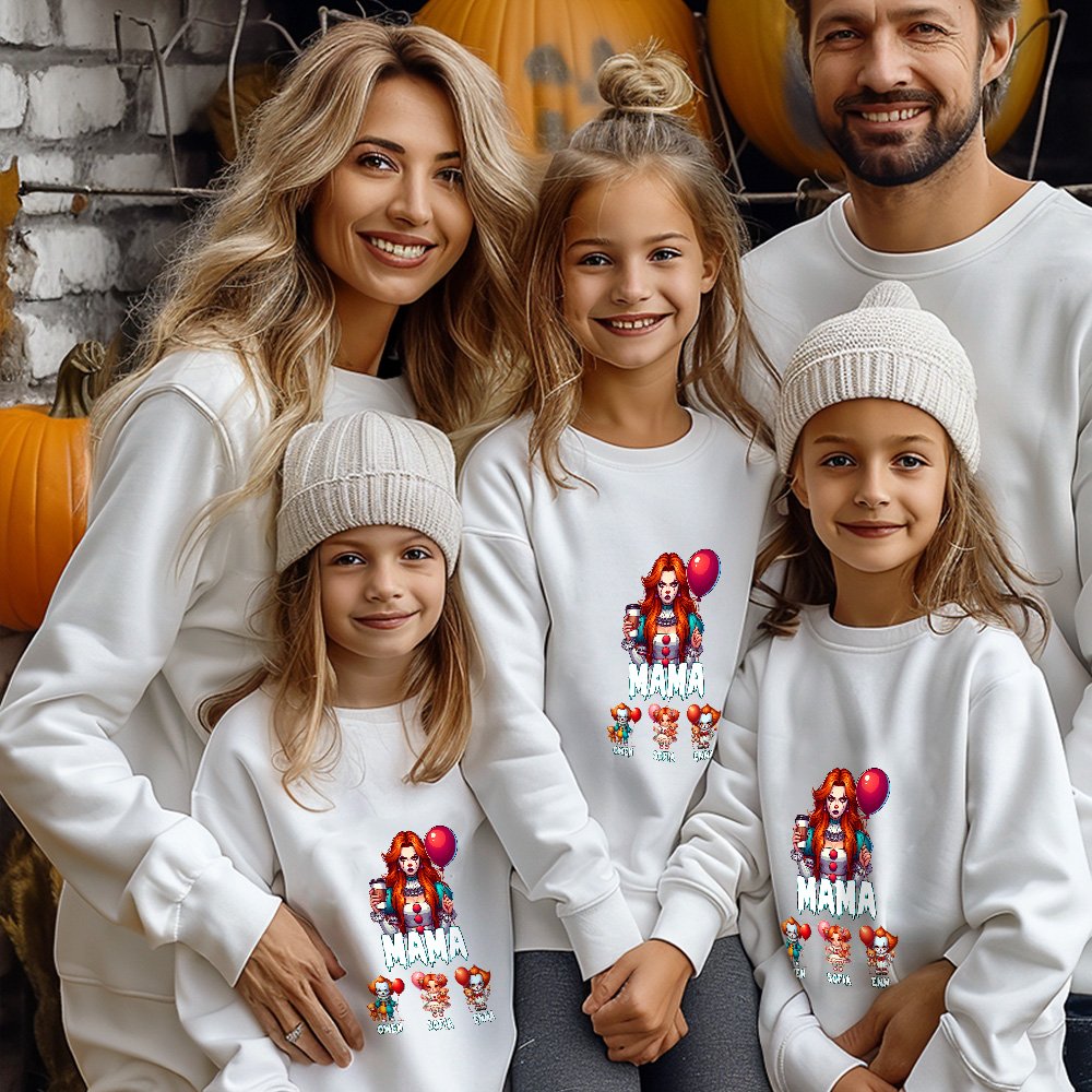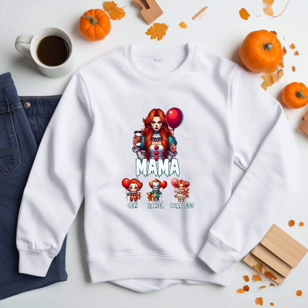 This t-shirt or sweatshirt features a fun "Horror Mom" theme, perfect for embracing the spooky spirit of Halloween. Customize it with the names and images of 1 to 4 children, making it a standout piece that showcases your family’s personality during the festive season.