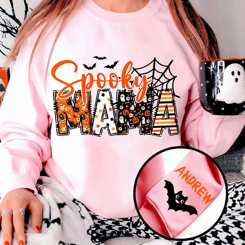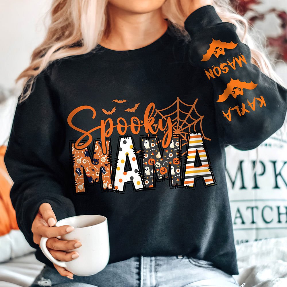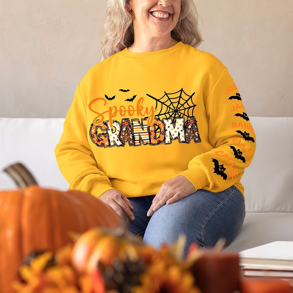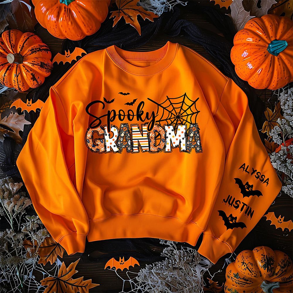 This crewneck sweatshirt comes in two playful designs, "Spooky Mama" and "Spooky Grandma", featuring Halloween-themed elements like bats and spider webs. You can customize it with 1-8 kid names on the sleeves, making a wonderful Halloween costume for mom or grandma.