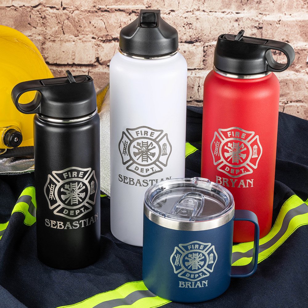 This Personalised stainless steel mug or water bottle is a perfect gift for firefighters. It features a laser-engraved customizable name, incorporating the iconic Maltese Cross symbol, which represents protection and honor. Available in four sizes: 14oz, 18oz, 32 oz, and 40oz.