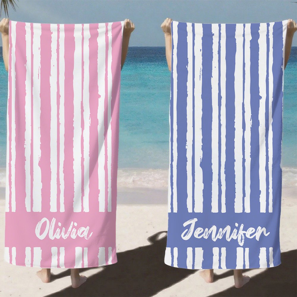 This vibrant beach towel features a lively striped pattern that adds energy and fun to your summer moments, capturing everyone's attention. The unique handwritten name design, combined with Personalised customization, ensures you'll stand out no matter where you are.