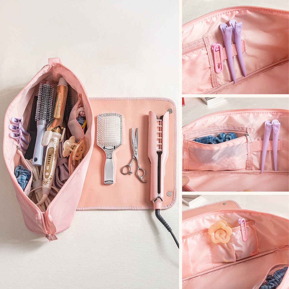 This bag comes with multiple compartments, including two internal pockets, a zippered pocket, and elastic sections for hair clips. It efficiently organizes all your hair styling tools, such as straighteners, curling irons, and brushes, keeping everything neat and within reach.