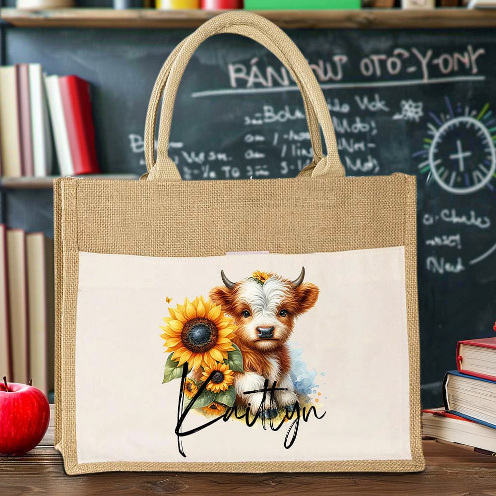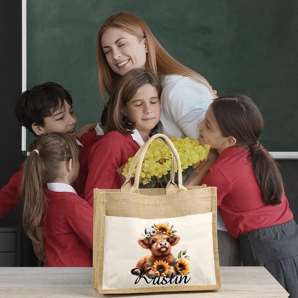 This jute tote bag with a Personalised sunflower Highland Cow pattern is specially designed for you who love Highland Cow culture. We can customize your name on a prominent position on the bag. Whether for personal use or as a gift to relatives and friends, it can convey deep love and care.