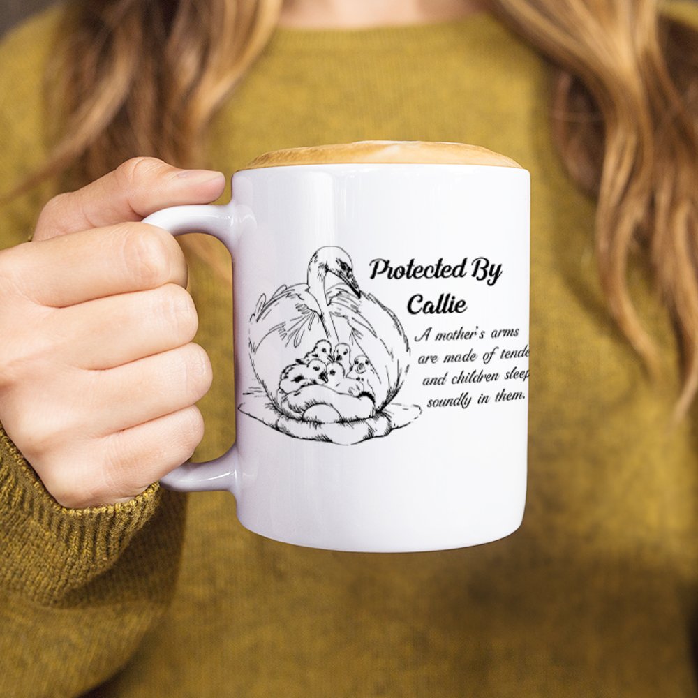 This mug is designed with a mother swan, with a picture of a swan protecting her baby geese with its wings, and comes with several different heartwarming words and names. It is the best gift for moms and grandmothers. Moms and grandmothers protect their young children like swans. You can also add your name to make it a unique work of art that shows your personality and conveys blessings.