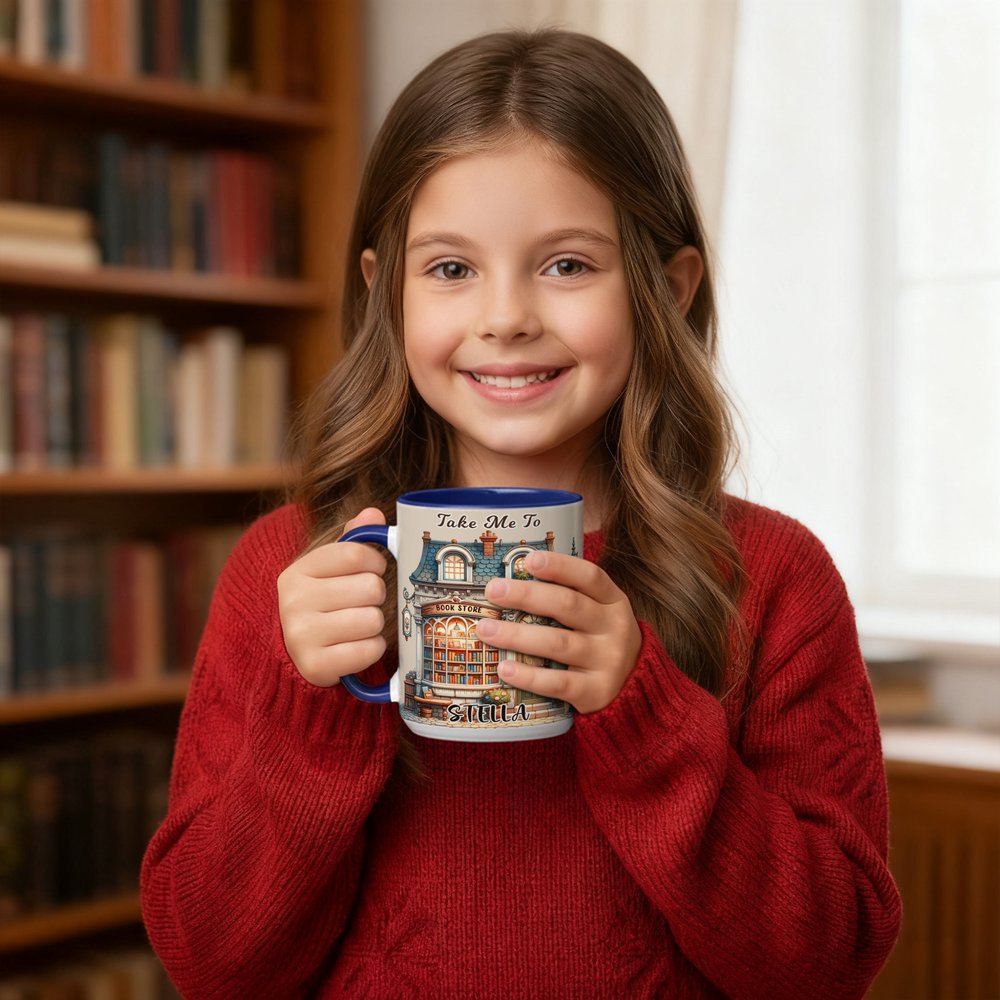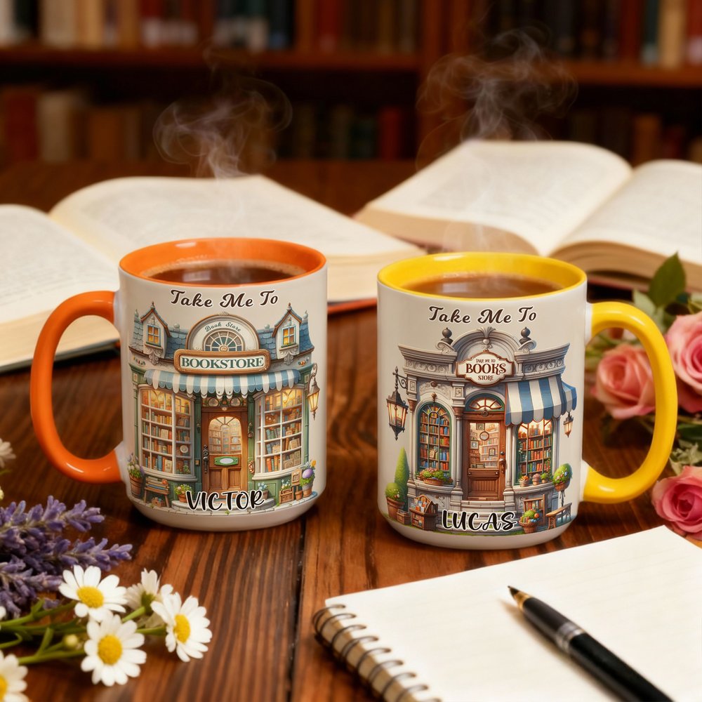 This mug features a beautiful bookstore theme, incorporating elements like vintage bookshelves and artistic window displays, along with the signature "Take Me To" text, instantly appealing to book lovers! It supports Personalised name customization and comes in a variety of colors, allowing you to create a unique, Personalised item. A matching coaster is also available for a perfect match, enhancing both the user experience and the decorative appeal.