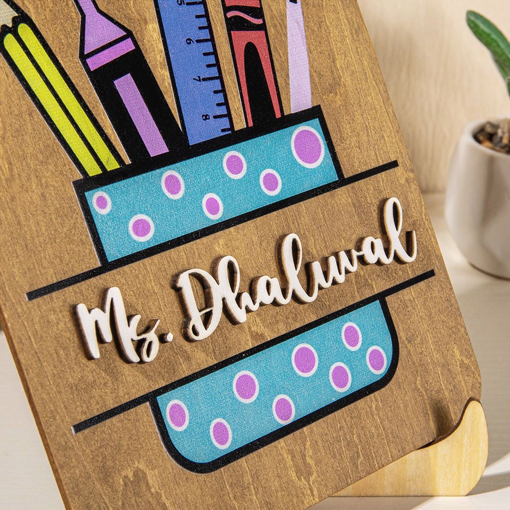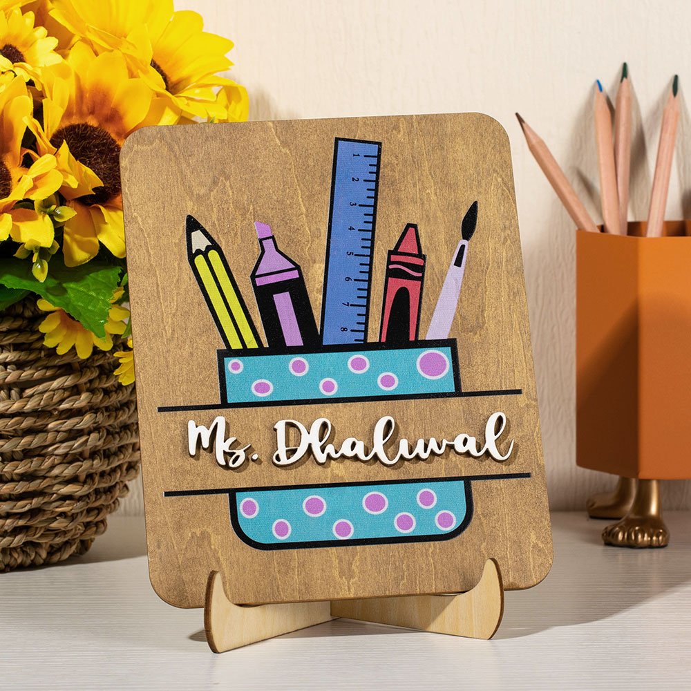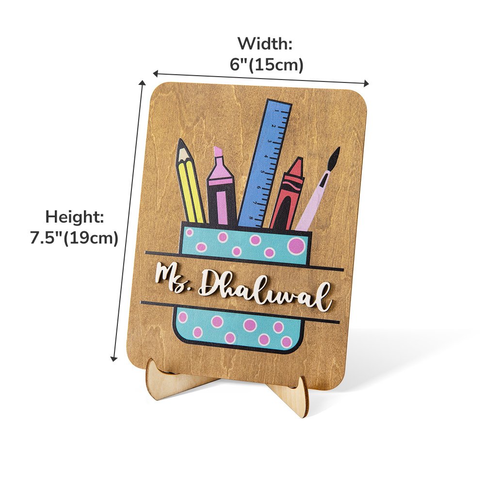Crafted from high-quality materials, this desktop sign is both durable and stylish. The top layer of the desktop signage adopts exquisite laser cutting technology, which is durable, and the surface is printed with colored stationery patterns. The teacher's name is taken laser cut and painted technology and then pasted on the base, which is full of three-dimensional effects. Desktop signage dimensions are approximately 7.5 inches tall and 6 inches wide. And comes with an included stand, easy assembly is possible.