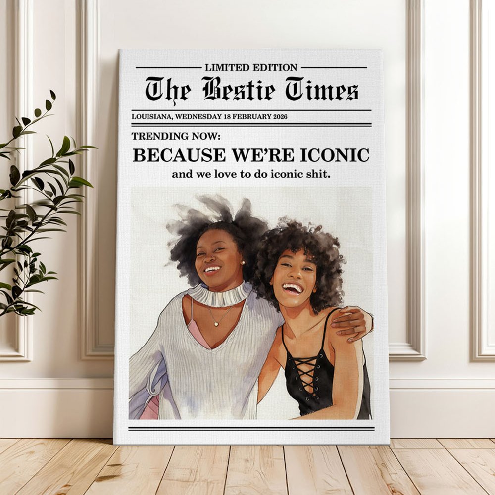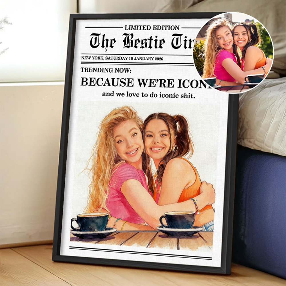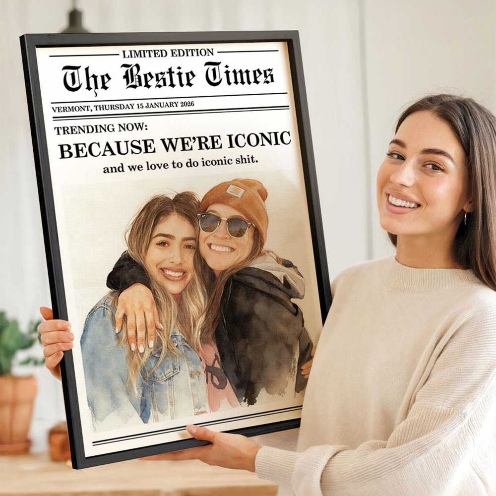 This unique artwork transforms your bestie photos into a watercolor-pencil illustration styled after the classic New York Times layout. You can customize it with: a “limited edition” header, a playful trending headline, and text. The blend of artistic watercolor-pencil texture and iconic newspaper formatting turns a casual snapshot into a one-of-a-kind tribute to your friendship.