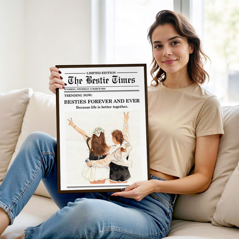 Ideal for decorating any living area: hang this artwork, the framed print, in your bedroom as a cozy reminder of your bestie, display the unframed artwork version in a living room gallery wall, or prop the poster-style artwork on a study desk. This artwork’s classic newspaper aesthetic blends seamlessly with modern, boho, or casual decor styles, adding a personal, artistic touch to daily spaces.