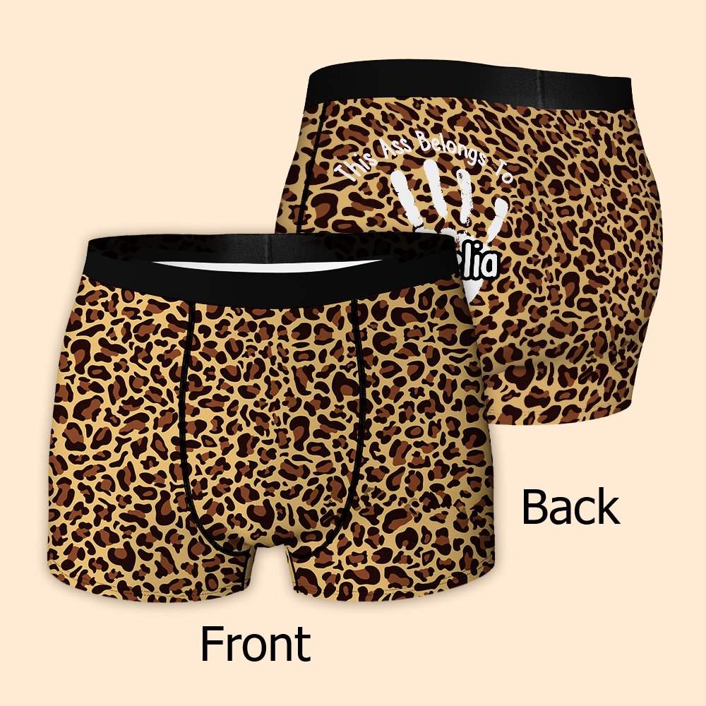 These men's briefs feature a fun, intimate theme with "This Ass Belongs To" and a palm print with a customized name. The bold and humorous design turns the briefs into a declaration of love as if they were being gently “stamped” by your lover, humorously expressing your possessiveness.