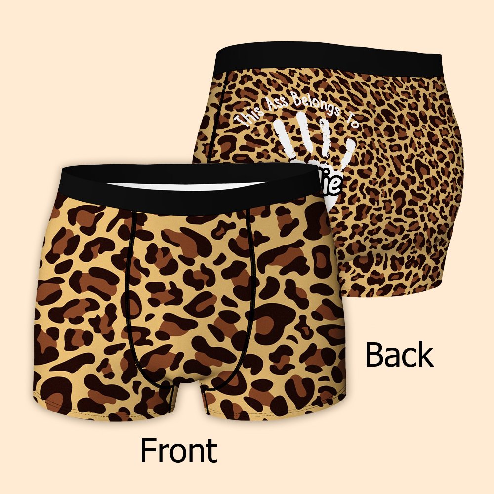 These men's briefs feature a fun, intimate theme with "This Ass Belongs To" and a palm print with a customized name. The bold and humorous design turns the briefs into a declaration of love as if they were being gently “stamped” by your lover, humorously expressing your possessiveness.