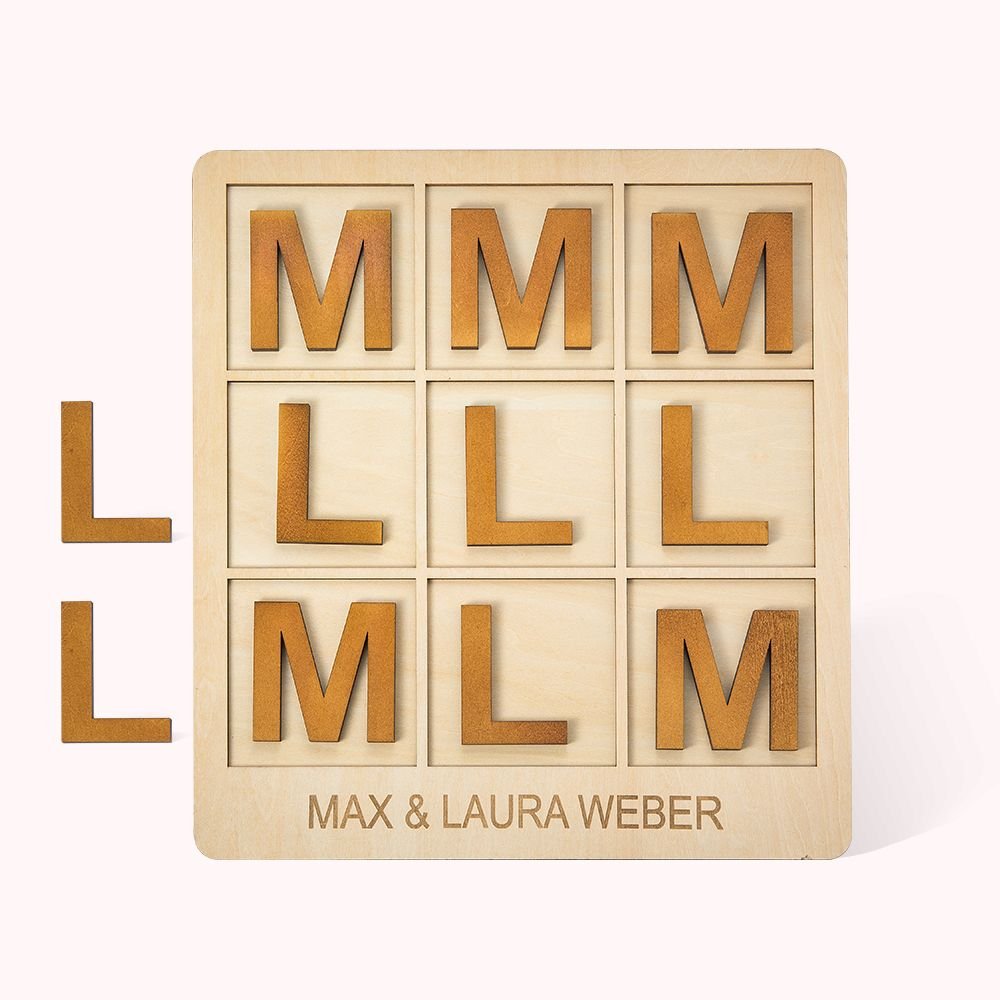 • Wedding or Housewarming gifts: Hey, we added some exciting things to Tic Tac Toe. You can see that we replace the regular playing pieces "X" and "O" with custom letter pieces. Customize this Tic Tac Toe with the first letters of the names of the husband and wife. And at the bottom of the board, you can customize the name, phrase, etc. This will be a creative anniversary gift or Valentine's Day gift!