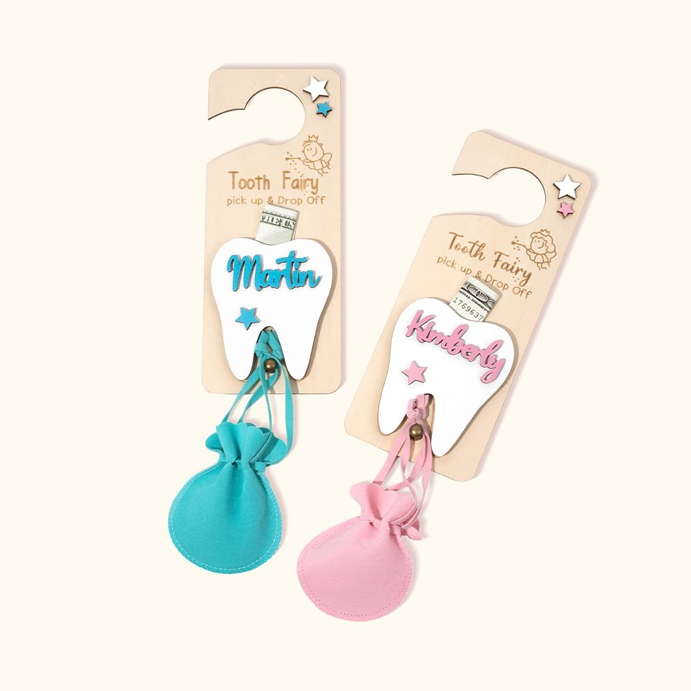 [MAGICAL GUARDIAN TOOTH TOUR]: Children can safely put their precious milk teeth in this charming tooth fairy door hanger and treasure them with the exclusive pouch that comes with it. This is not only a simple storage tool but also the key to opening the magical world of children. The product can be customized with the child's name, and every little detail is full of fantasy and surprise, making children look forward to and happy on the road to growth.