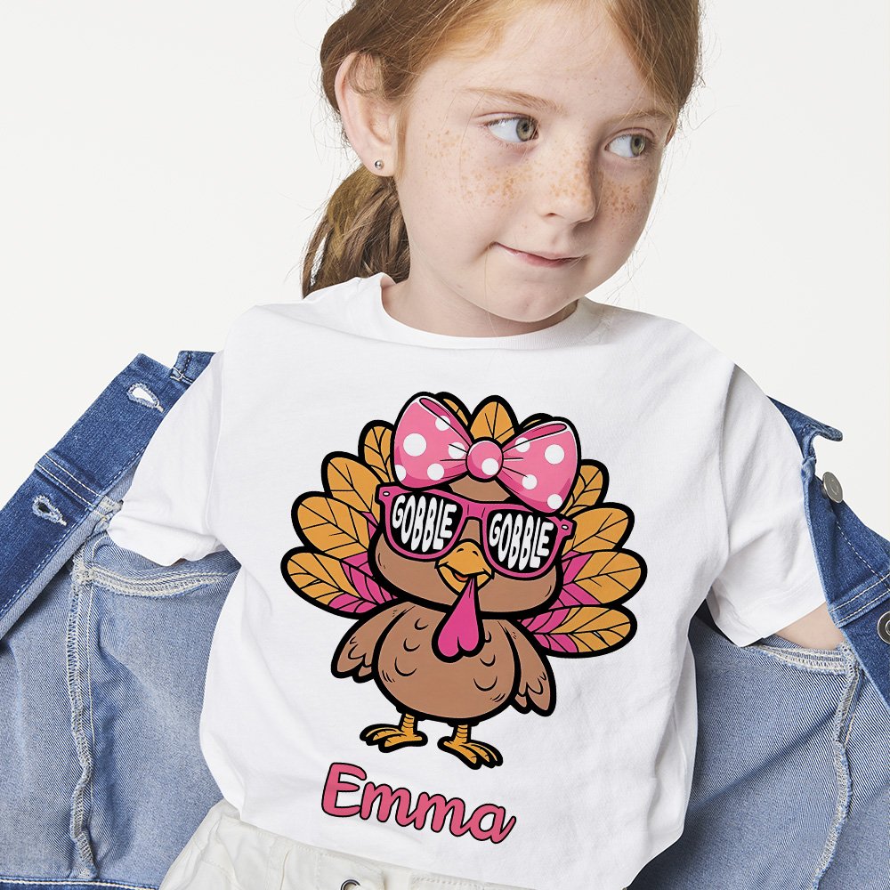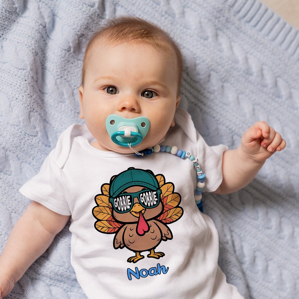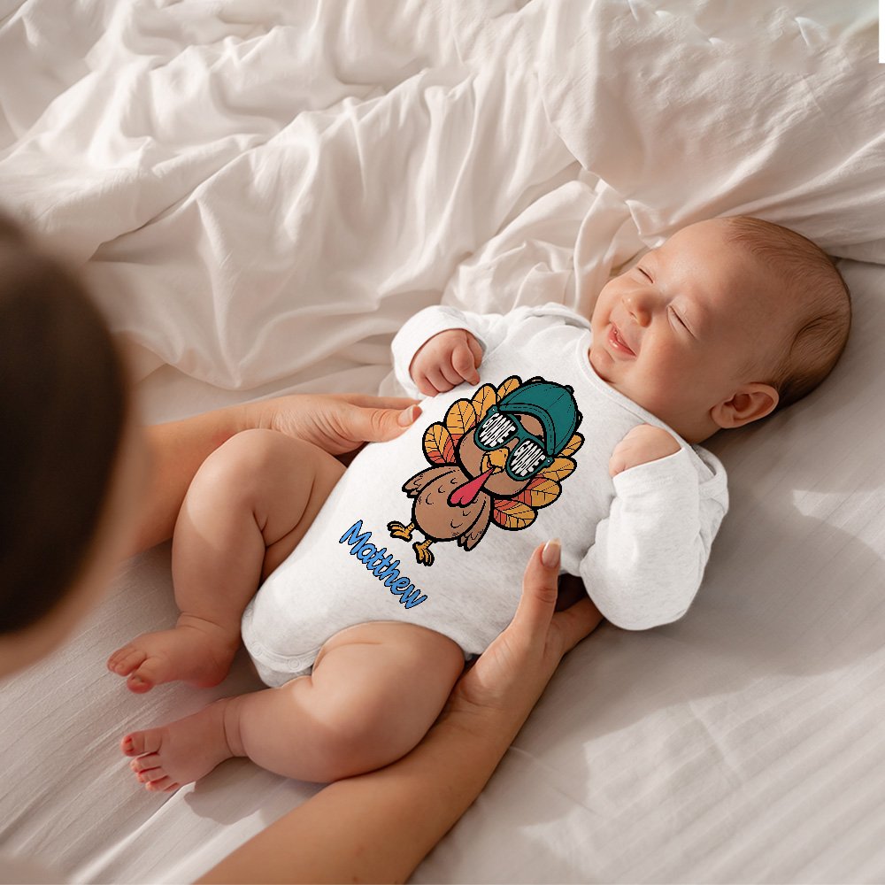 This kids' clothing line features charming a turkey wearing sunglasses. Adding a custom name provides a personal touch, making it the perfect way to enhance your child's holiday wardrobe.