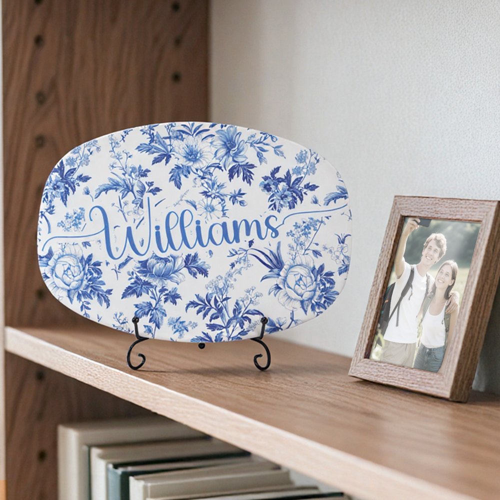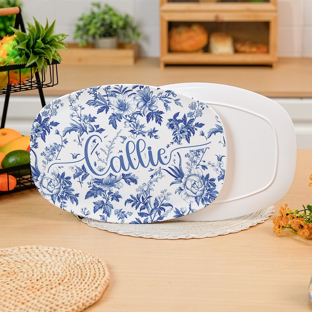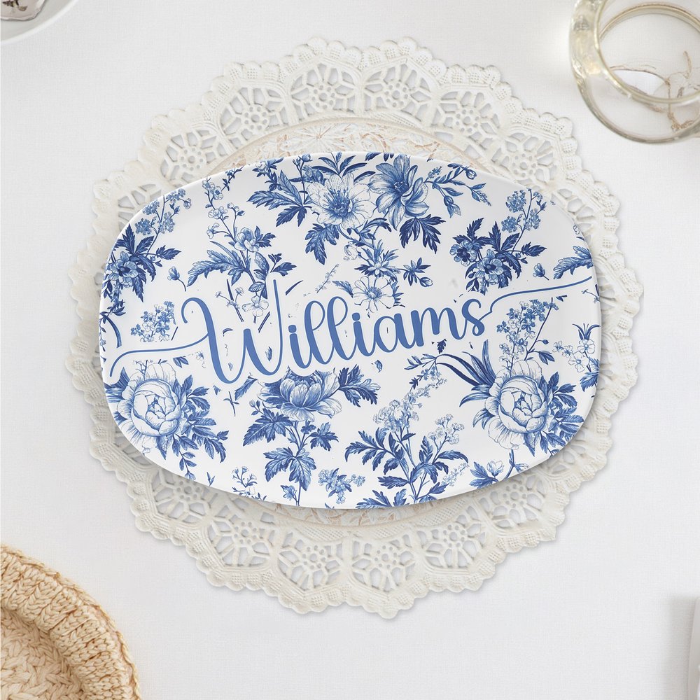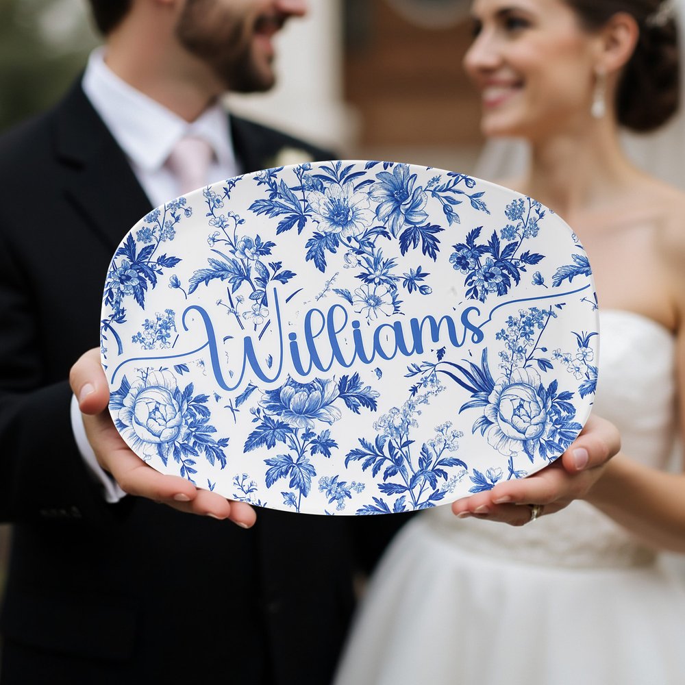 Inspired by 18th-century French country style, this platter features a classic blue toile de jouy floral pattern, embodying a rich, vintage aesthetic. "Something blue" symbolizes loyalty, purity, and love. This colour has been associated with weddings since ancient times and symbolizes good things. The platter can be customized with your family name or name, making each one unique.