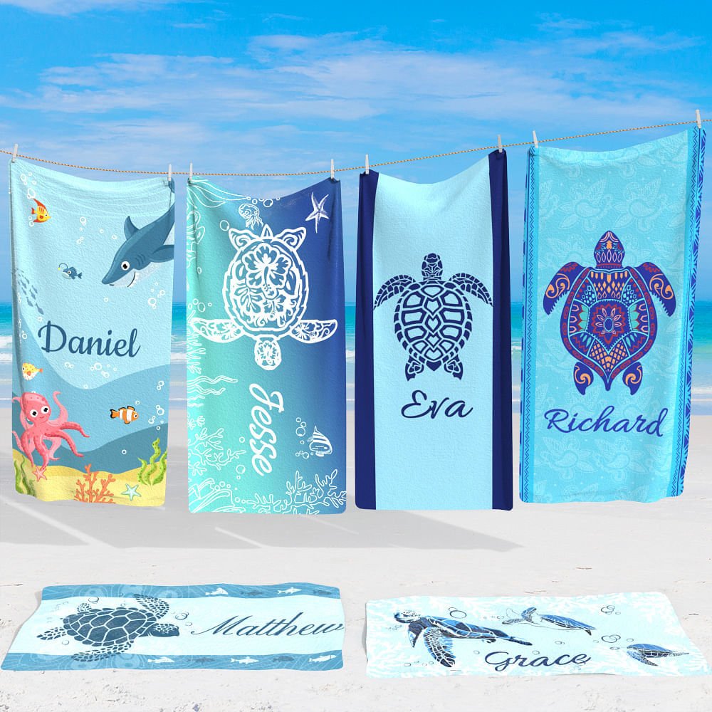 Elevate your beach experience with this vibrant beach towel, featuring a lively blue ocean motif adorned with playful turtles and fish. Personalise it with your name for a unique touch that transforms it into the perfect accessory for beach lovers and water sports enthusiasts alike.