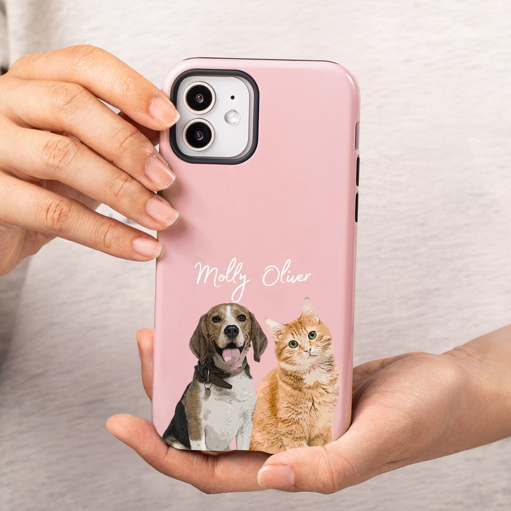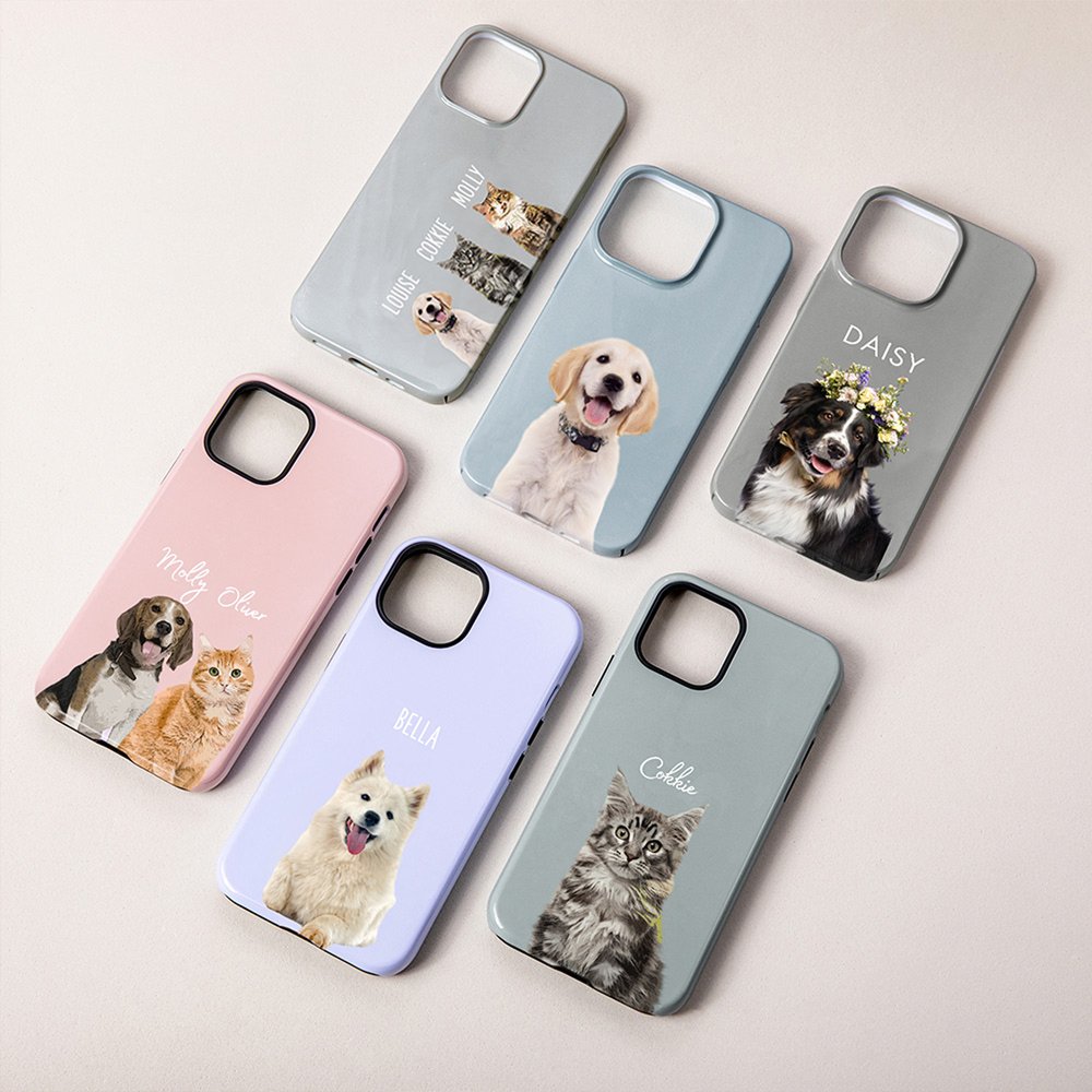 Our phone cases are pet-themed and available in a variety of colours. You can upload 1-3 photos of your pets to make them the protagonist of the phone case and add their names to make it a unique and thoughtful gift.