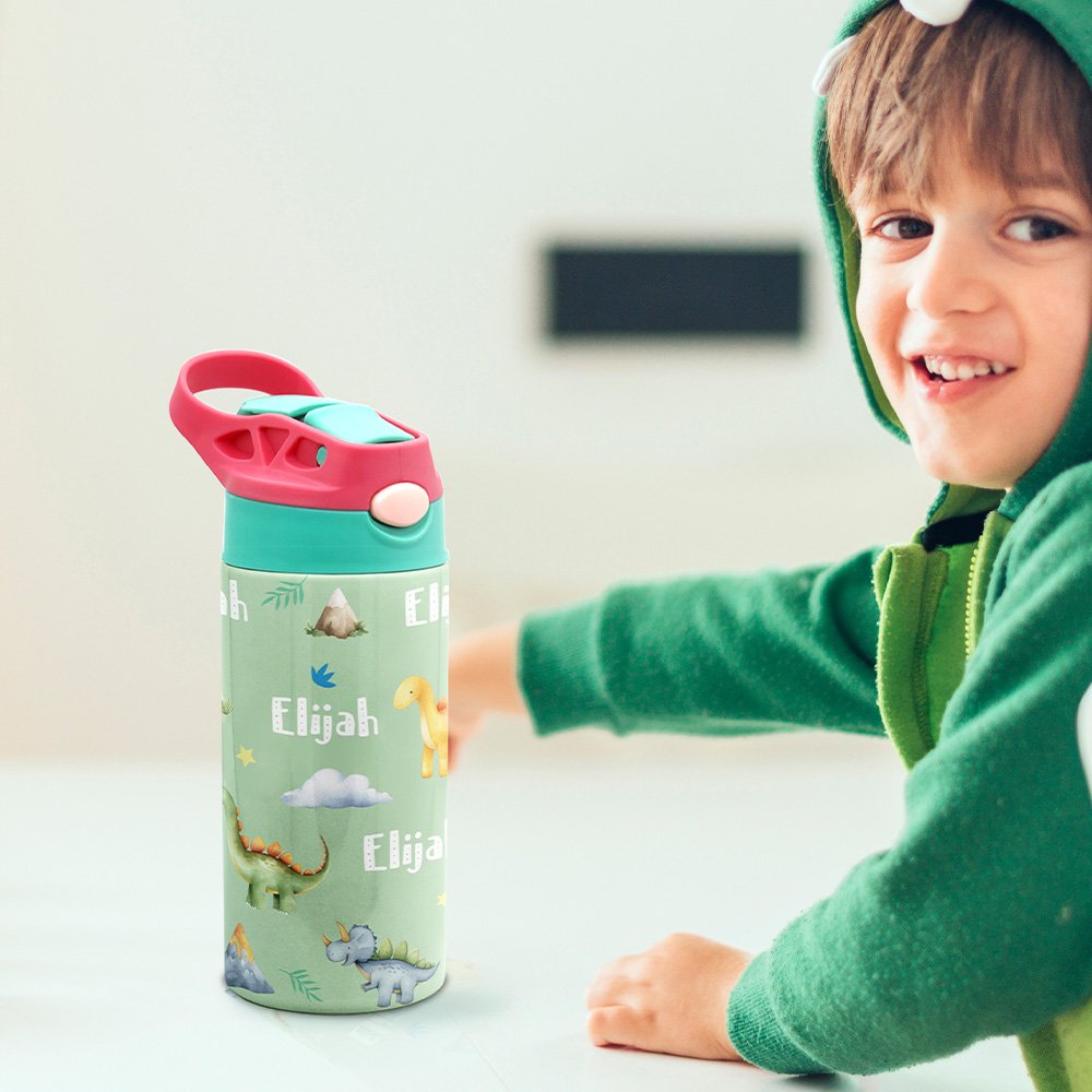 This 12oz kid water bottle features fun watercolor designs of cute animals like dinosaurs, dolphins, and more. With five themes, 20 vibrant background colors to choose from, and a customizable name, it sparks kids' creativity and joy in every sip.