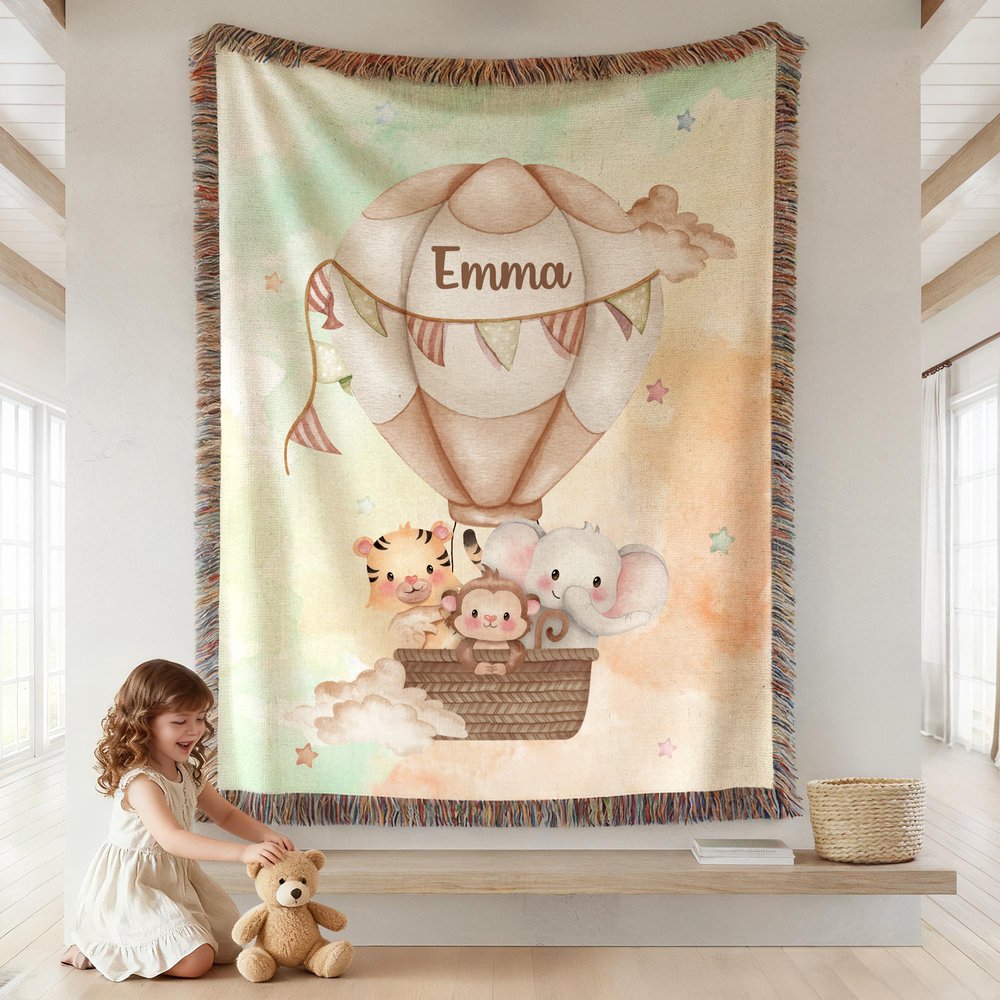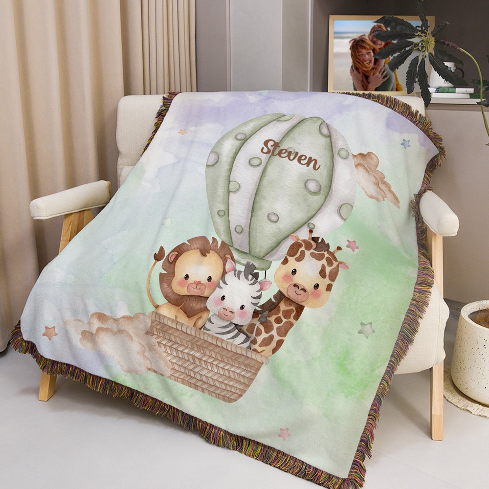 The watercolor blanket features a hot air balloon carrying cute safari animals, set against a soft sky background with stars. The style merges whimsical cartoon charm with gentle watercolor aesthetics. You can add a custom name. It feels warm, imaginative, and perfectly suited for a kid’s space — blending coziness with playful storytelling.
