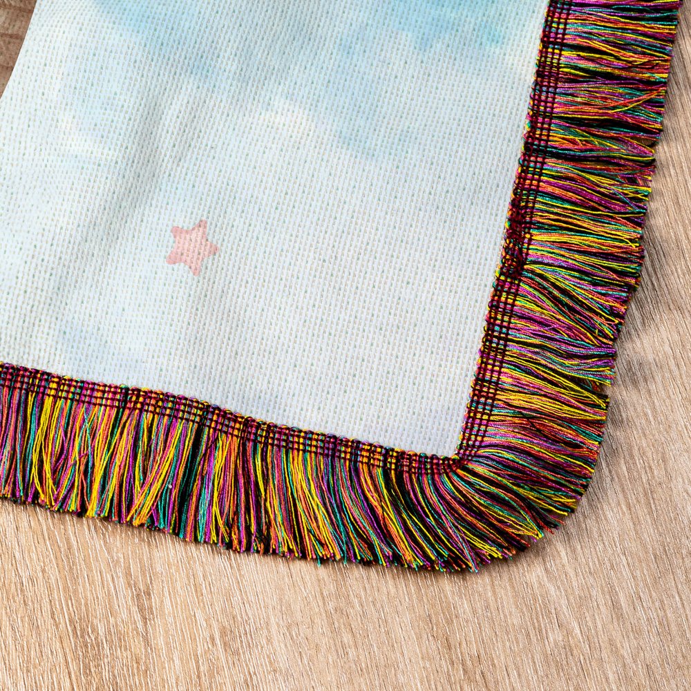 The fringes of this blanket are temporarily retained by stitches. Prior to use, locate the stitched segments along the fringe edges and gently snip said threads with scissors.