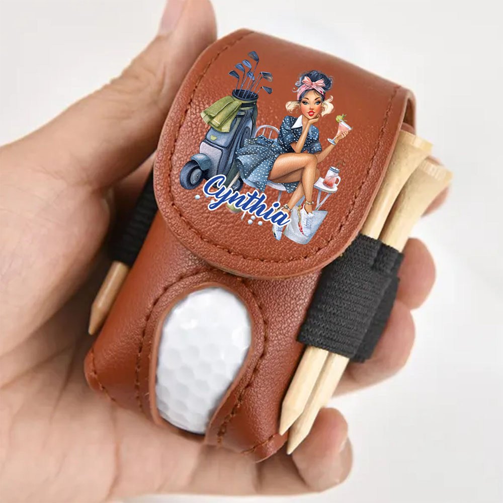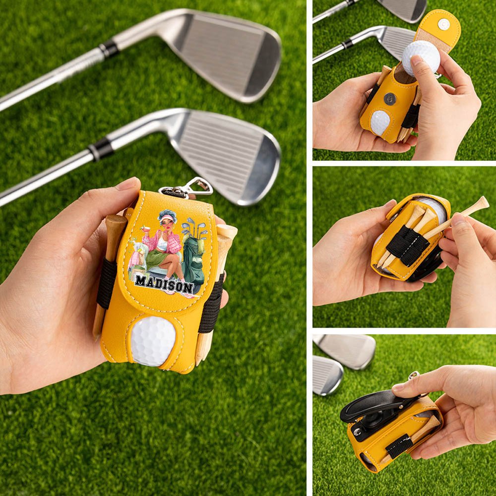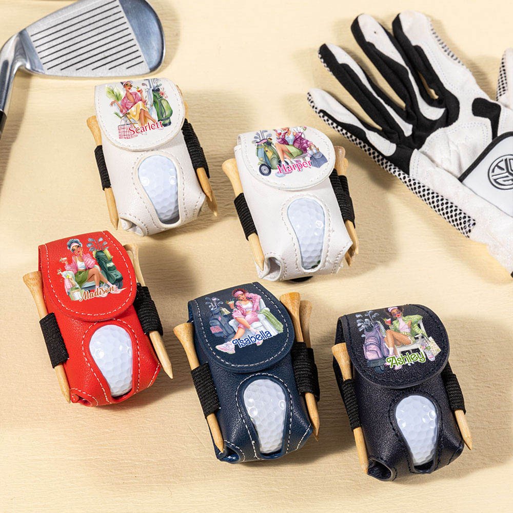 The secure button closure ensures quick access to golf balls, while the sturdy carabiner easily attaches to your golf bag or belt. Thoughtful design features include convenient holes on the bottom and tee racks on both sides, accommodating up to four tees and two golf balls, ensuring golfers always have essentials within easy reach. The compact size and stylish design make it a must-have accessory for any golfer, whether on the driving range or on the course.