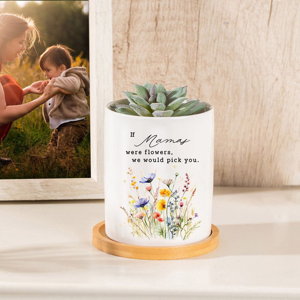 This ceramic planter is an ideal gift for Mother's Day, with a watercolour floral design on the front of the planter, and colourful flowers to signify beauty. You can add a designation to it with the thoughtful phrase "l/We would pick you" for added warmth.