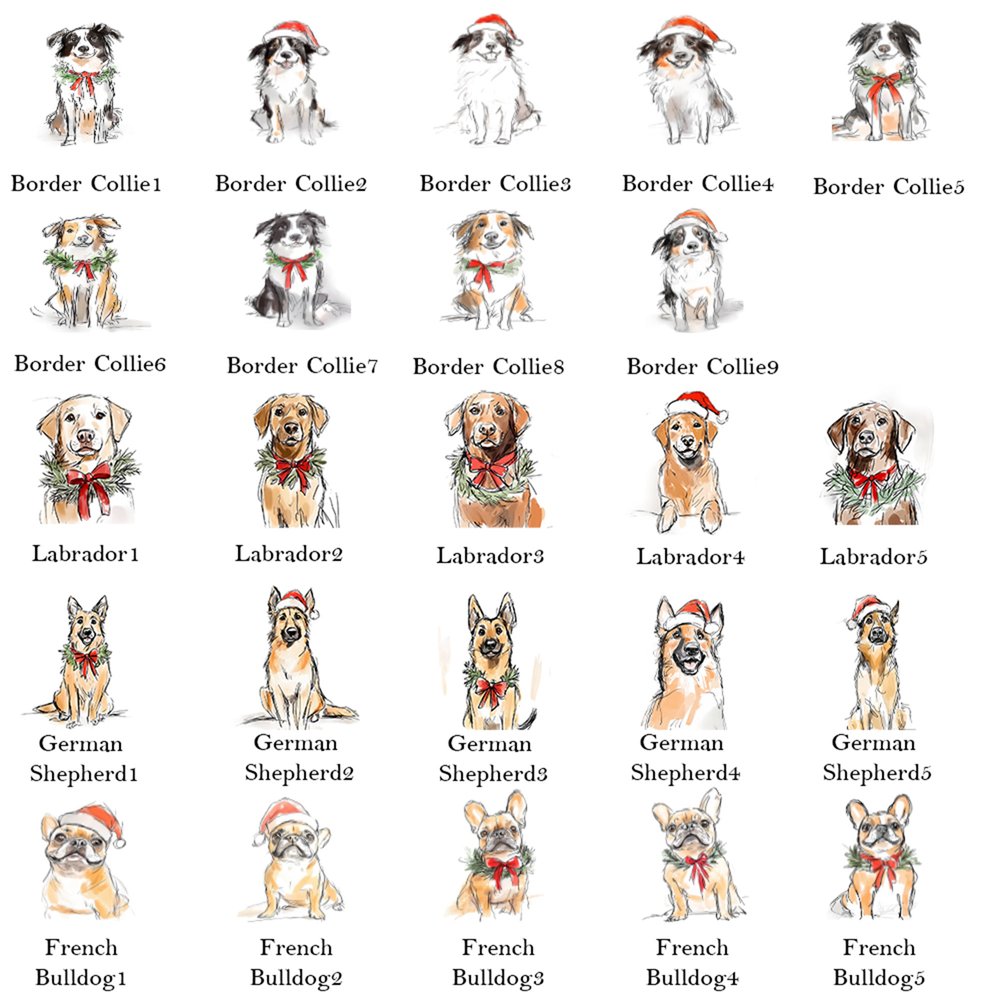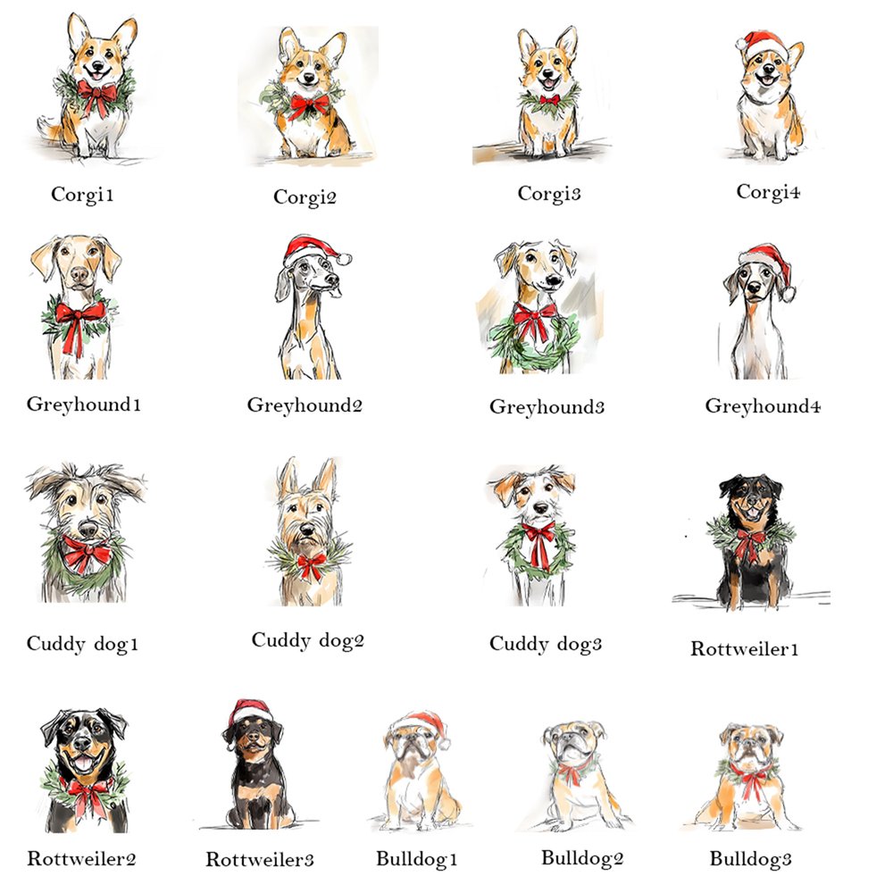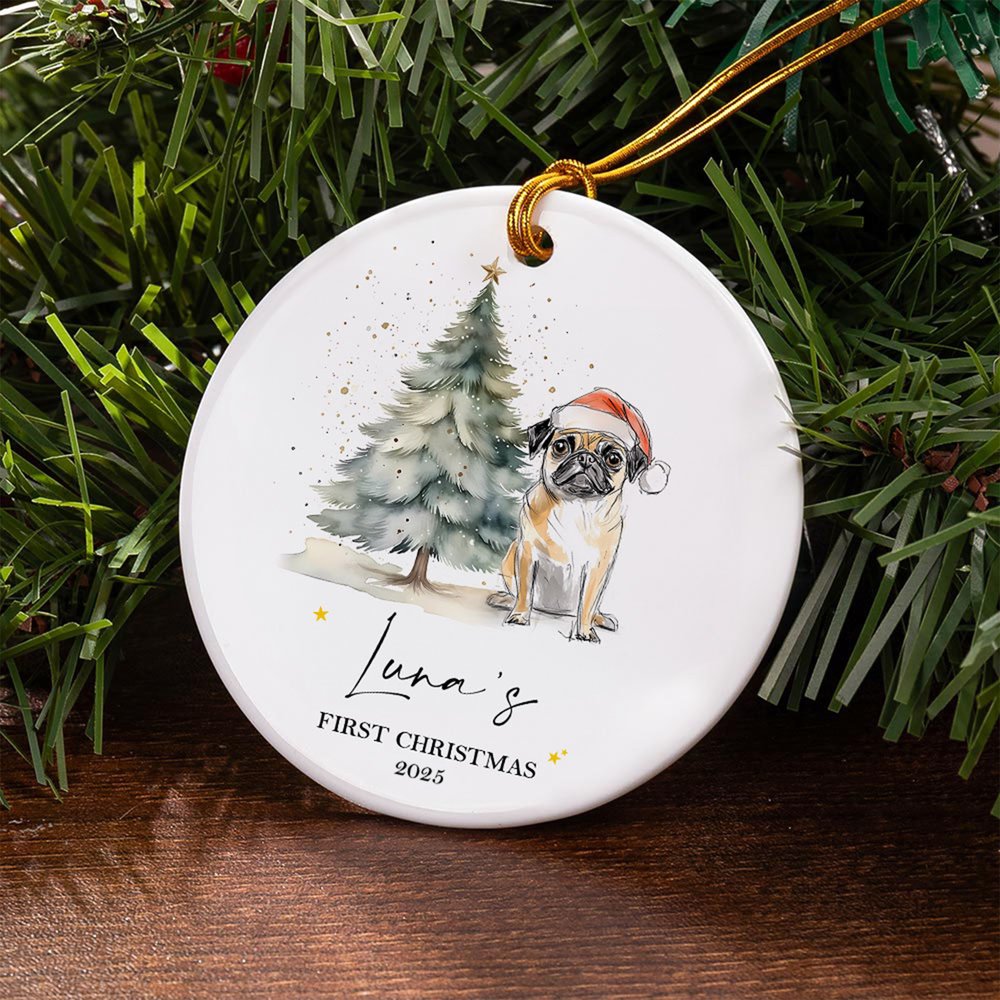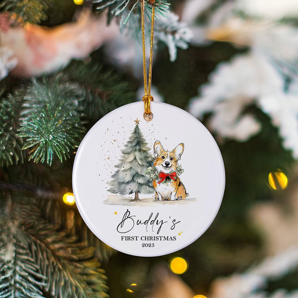 Celebrate the special dog lover in your life with this Personalised ornament featuring a charming hand-drawn watercolor style. The dogs were dressed in cute Christmas costumes, wearing Santa hats, mistletoe wreaths, etc., and waiting next to the Christmas tree. It's the perfect accessory to celebrate a dog lover's first Christmas season with their furry friends.