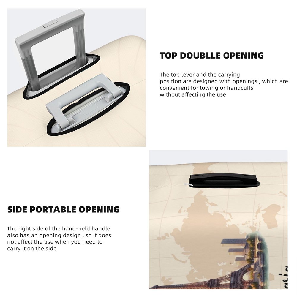 It's made of high-quality polyester material, designed to be strong and durable. It's not just a decoration; it's a shield for your luggage. It can be tightly fitted to 18" to 32" luggage, effectively preventing scratches, collisions, and dirt. With two top openings and a side portable opening for easy use, it's a comprehensive protection system for your suitcase.
