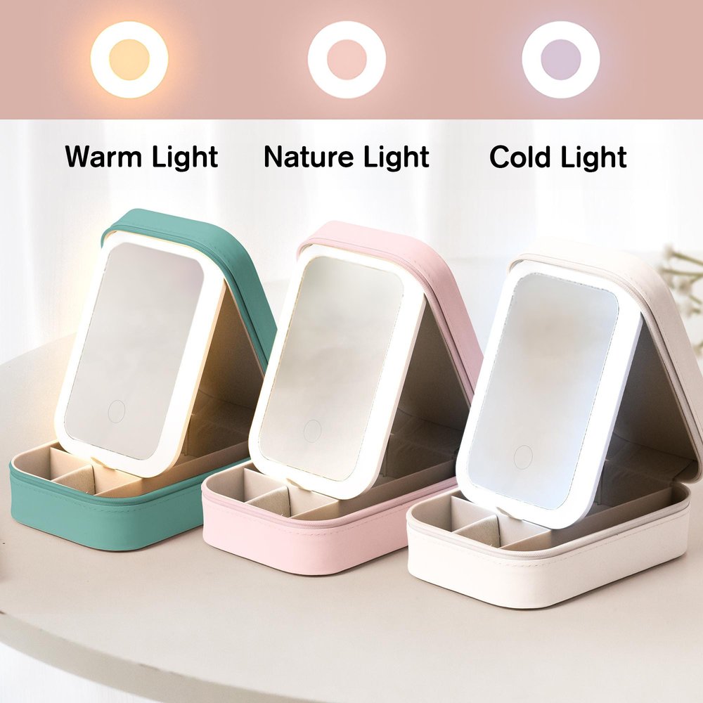 Equipped with an LED mirror, it has three dimmable settings - warm light, natural light, and cold light, which can be used to create different atmospheres. It comes with a charging cable and can be used for about a week on a single charge. Whether you are preparing for a night out or a leisurely vacation, you can choose the light that best suits your needs. This convenient mirror is perfect for applying and checking your makeup.