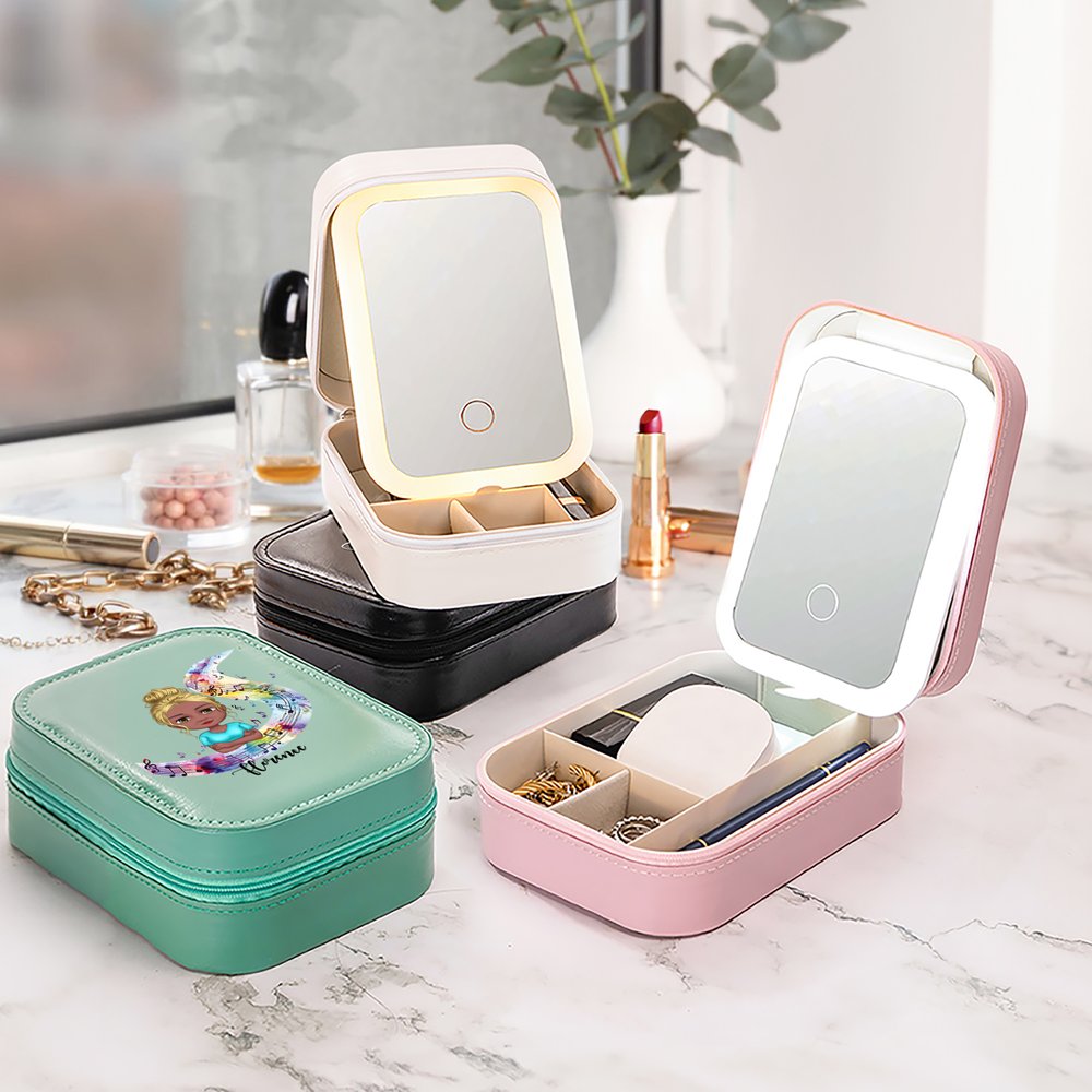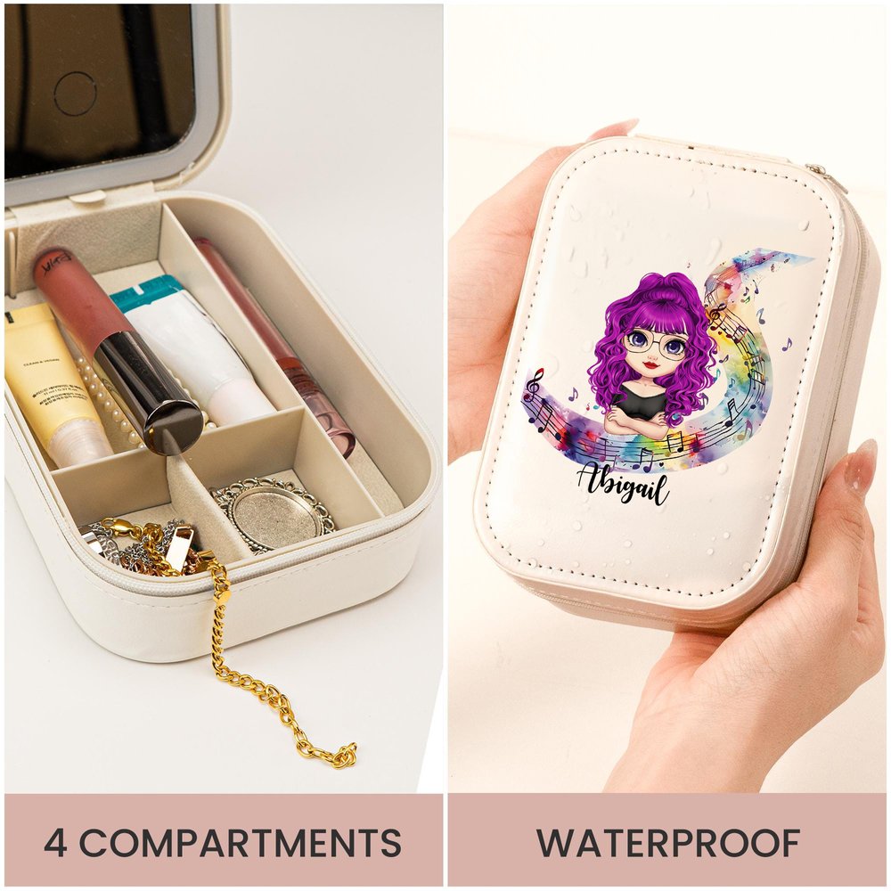 Personalised Watercolour Stave Musical Note Cartoon Character Leather Jewellery Box with LED Three-colour Adjustable Mirror Birthday Gift for Women