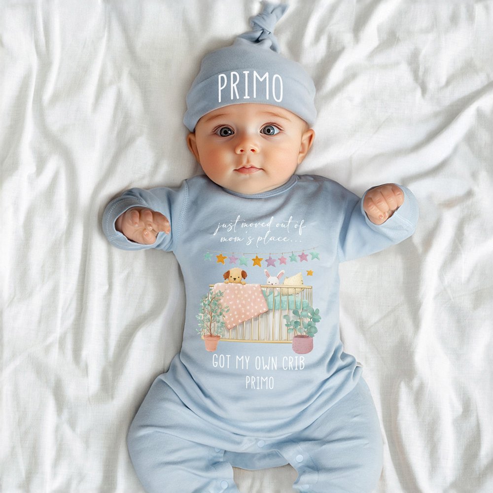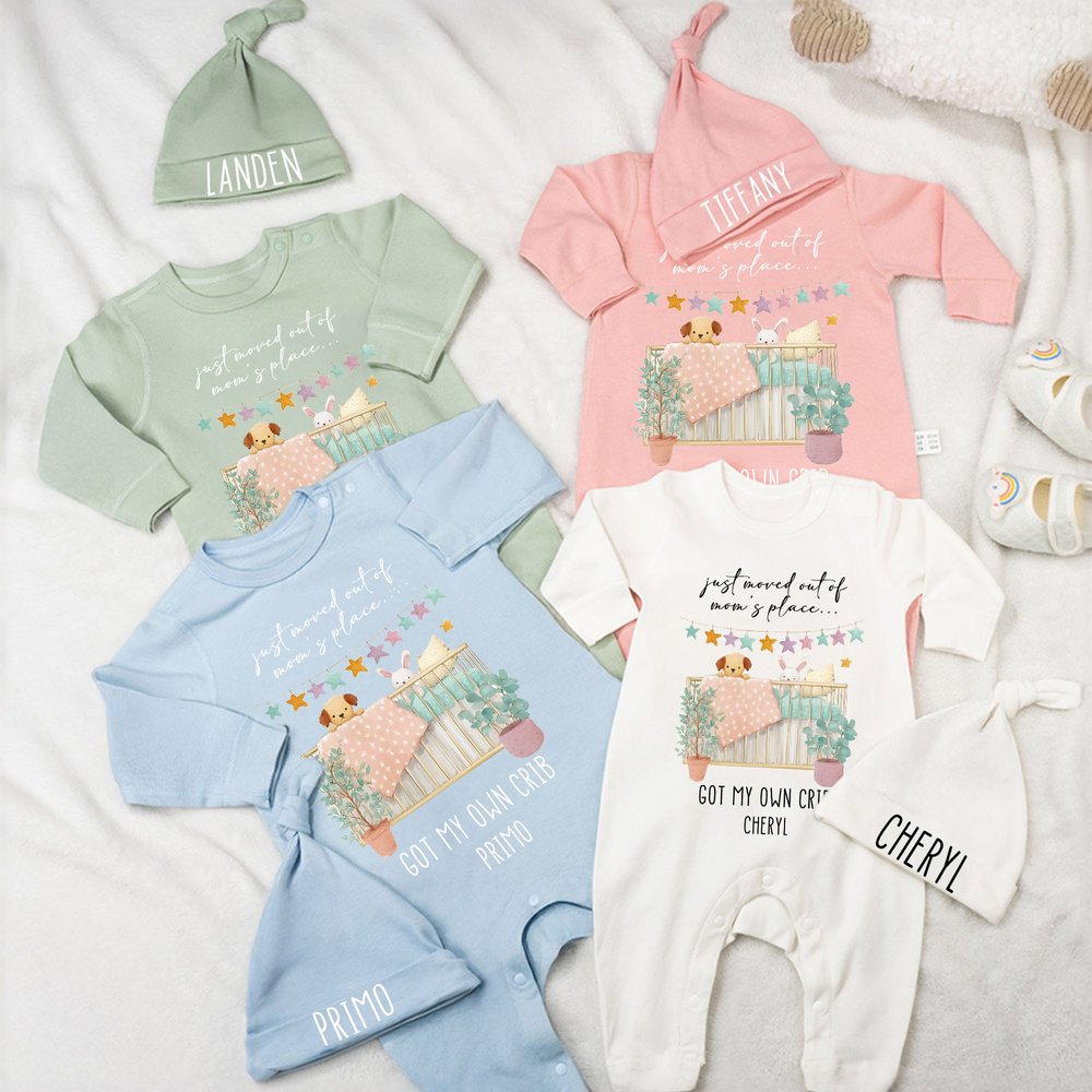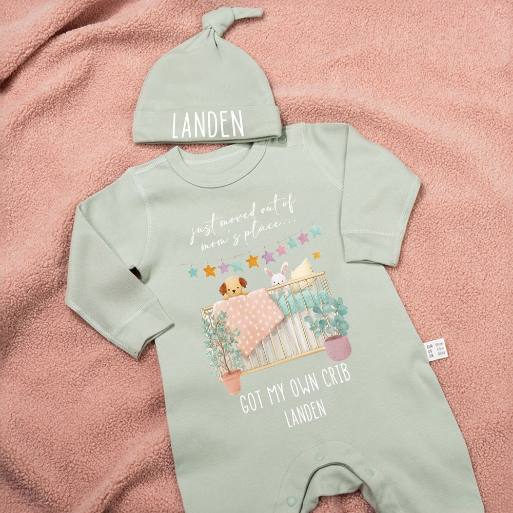 This baby bodysuit features a warm watercolour pattern with the humorous caption "Just moved out of mom's place got my own crib." Customizable with your baby's name, each one is a one-of-a-kind piece.