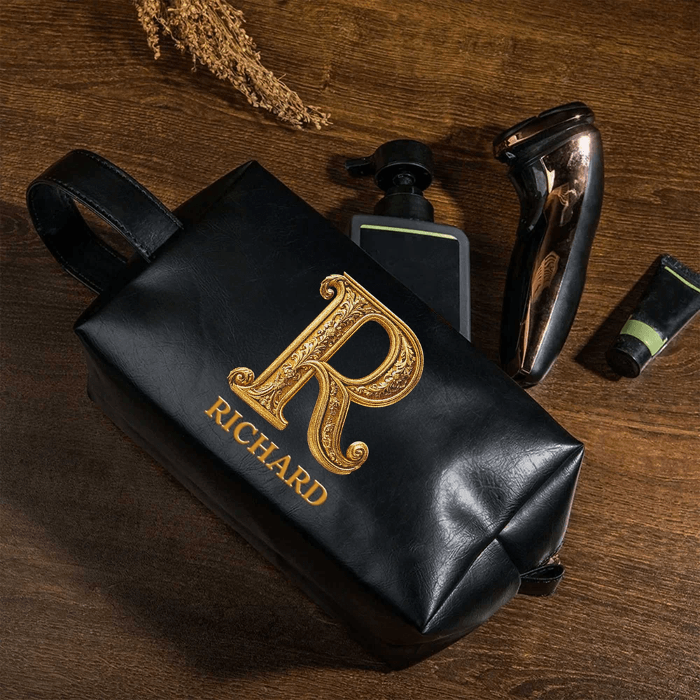 This sleek men’s travel pouch boasts a timeless vintage design with a rich PU leather finish, accented by an embossed golden initial and full name in ornate classic lettering. Available in multiple rich, earthy, and neutral color options, you can fully customize it with any first name and monogram to craft a truly exclusive, one-of-a-kind accessory. The refined, masculine aesthetic balances rugged style with polished sophistication for a standout Personalised look.