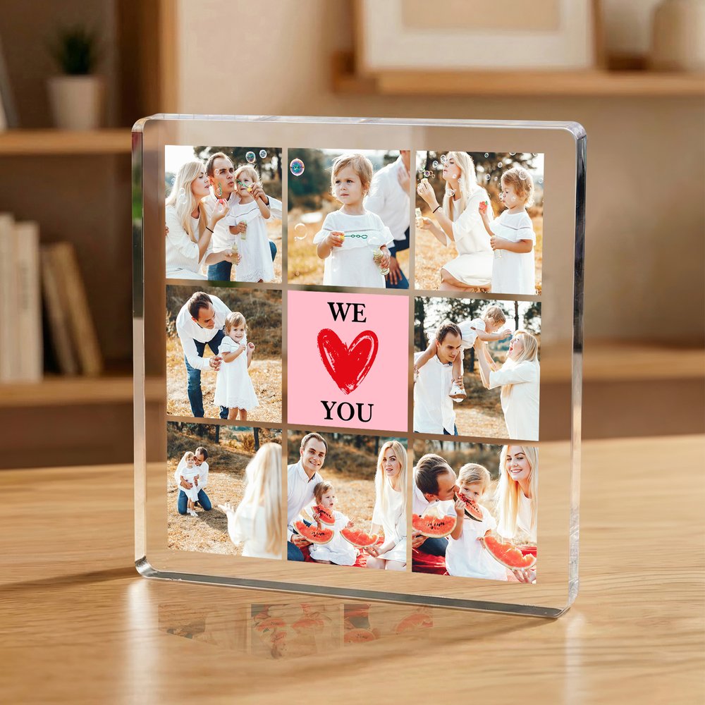 This beautifully designed piece features a nine-square grid, allowing you to upload eight Personalised photos. The centre grid is decorated with a heart pattern and the words "I Love You" or "We Love You", symbolizing the true meaning of love and reunion, allowing you to share your most precious memories with family and friends, enhancing the emotional connection between photos and making them a stunning focal point.