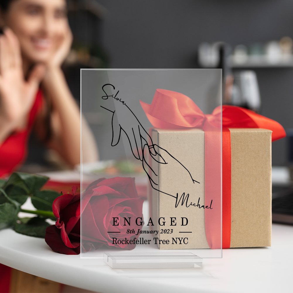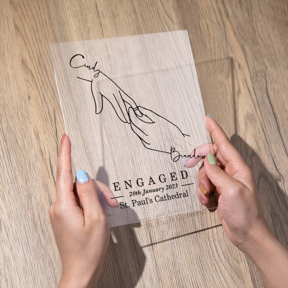 Celebrate eternal love with our Personalised acrylics. This exquisitely crafted plaque uses the minimalist gesture of wearing a ring to represent their upcoming marriage and eternal love. Customized names leave the best memories.