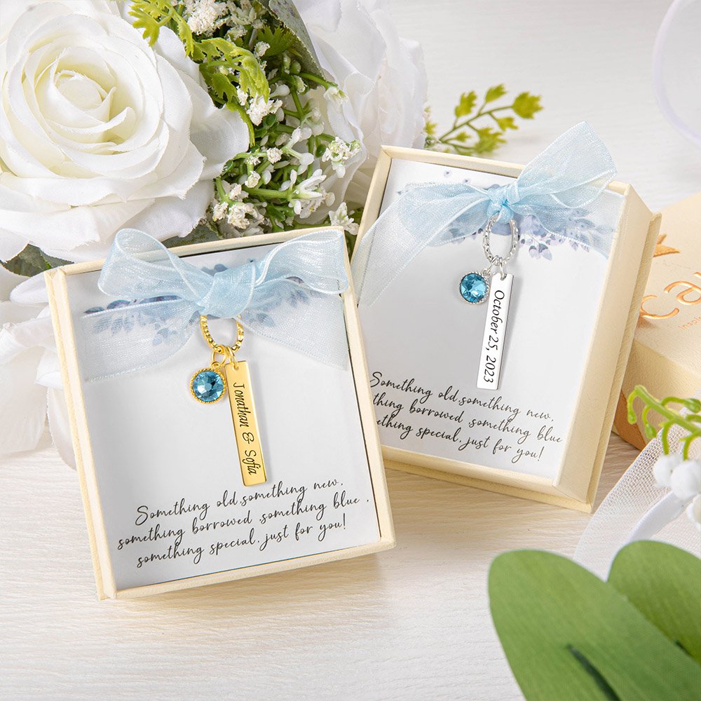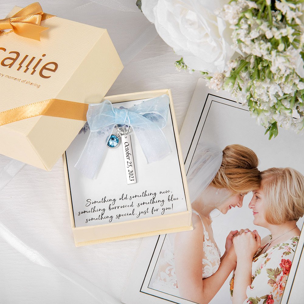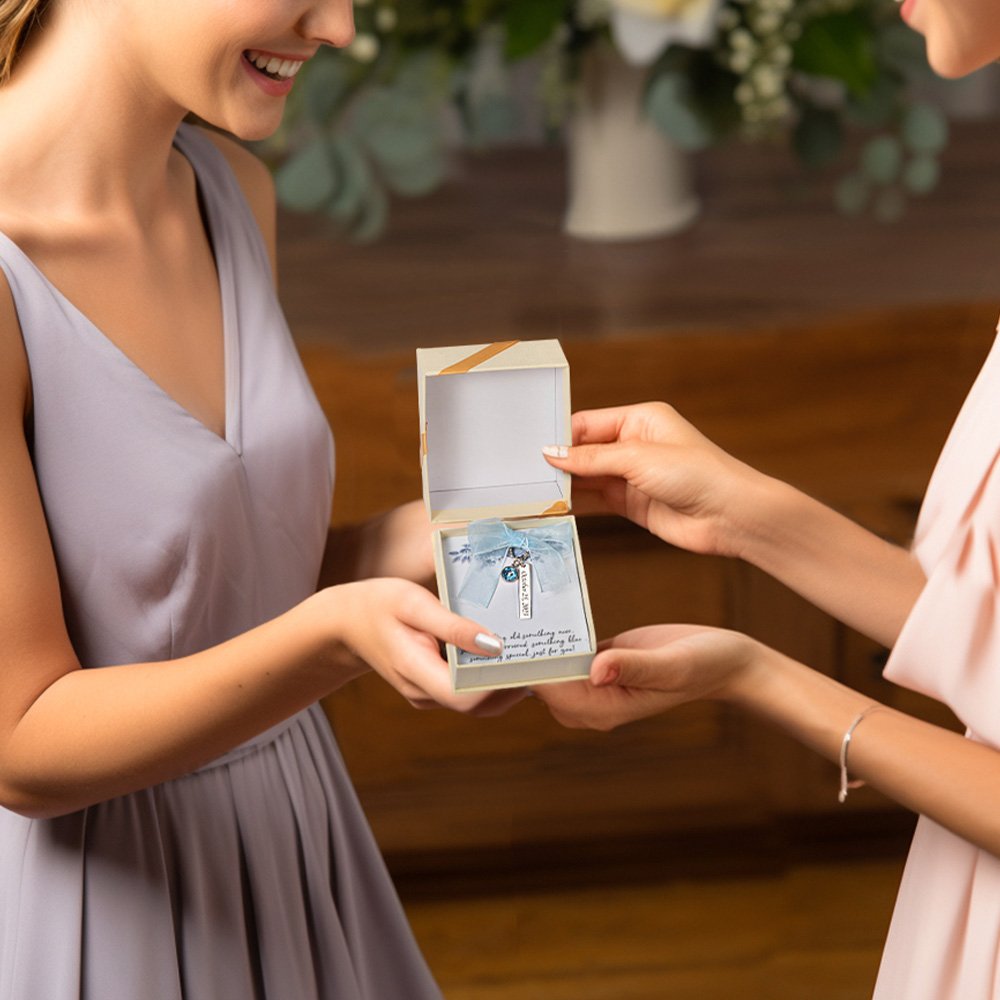 [BRING GOOD LUCK]: The blue crystal is believed to bring good luck and happiness to the bride. Blue also represents love, purity, and loyalty. Inside the box is a quote: "Something old, something new, something borrowed, something blue, something special, just for you!" The text expresses good wishes to the newlyweds.