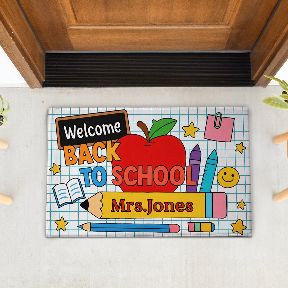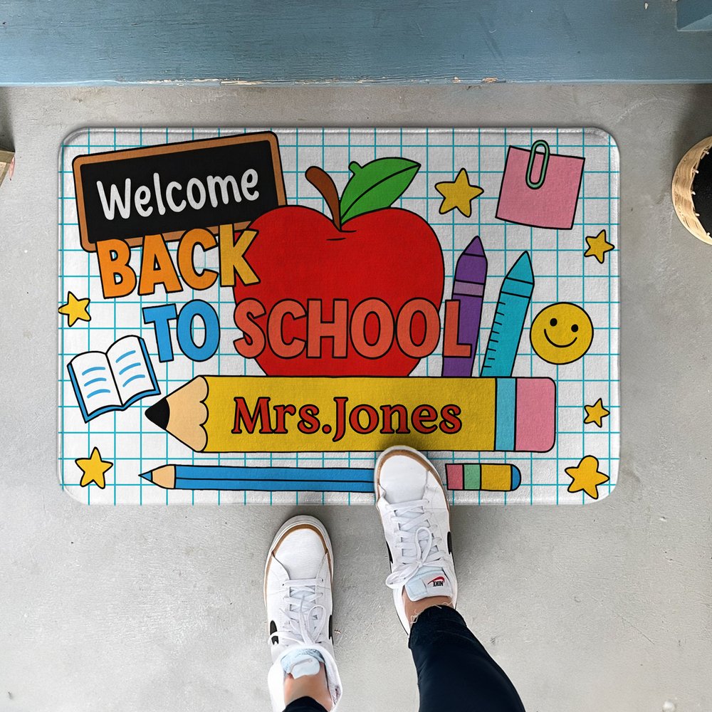 This doormat features a design centreed around welcoming teachers back to school, complemented by colorful font, smiley faces, and patterns such as checkerboards and stars, creating a bright and lively overall style. The glittering font makes the slogan stand out, while the smiley face patterns convey a joyful atmosphere. Customized teacher names add a personal touch, clearly expressing welcome to students while infusing the classroom entrance with warmth and personality, showcasing the teacher's enthusiasm for welcoming students back to school.